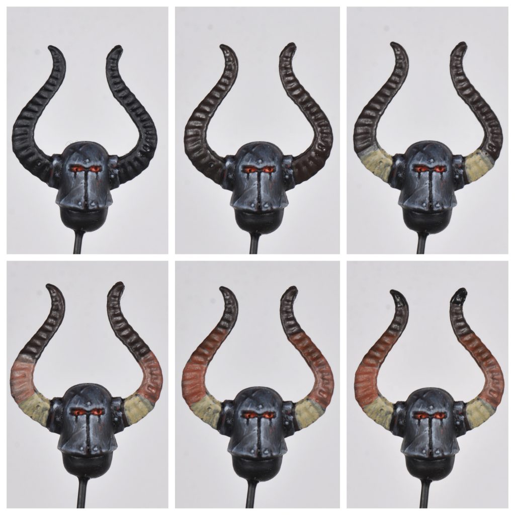 Top right: Citadel Mephiston Red layer in thick stripes going from base to ends of horns.