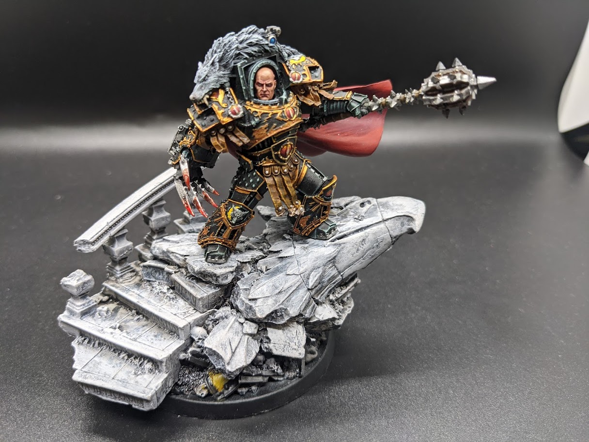 After having given this base something of a zenithal prime, I washed the intact "marble" bits of the stone with varying black shades - Nuln Oil, Soft Black Wash, a few thin coats of Basillicanum Grey. I then lightly drybrushed Celestra Grey over the entire base, and Corax White over the marble bits. This left a lot of the darker shaded bits exposed, giving it something of a very worn marble look. The powdered rubble bits were painted with Space Wolves Grey and Nuln Oil, to unify it with my other Black Legion/Sons of Horus stuff. Likewise, the Space Marine paldrons buried in the rubble were given a thinned down shade of Basillicanum Grey and Iyanden Yellow to mark them out as Imperial Fists (1) The trim was painted with Vallejo Black Metal and Black Templar. The base was then rimmed with Black Templar.