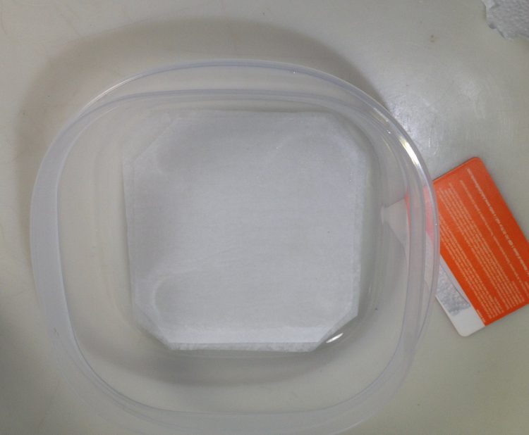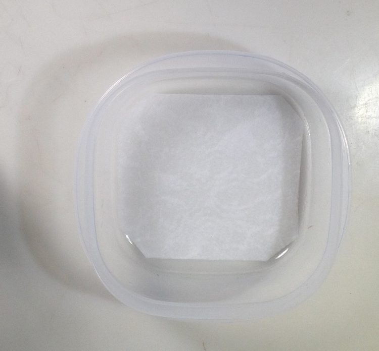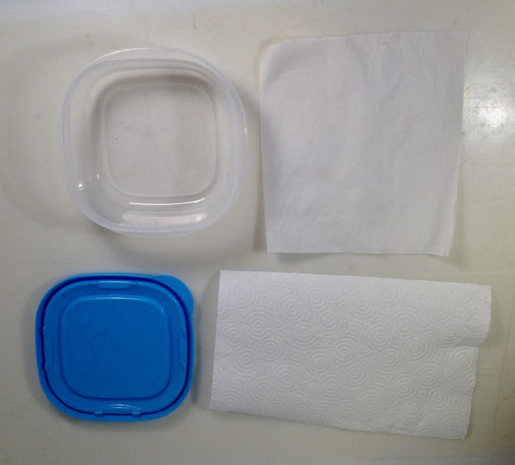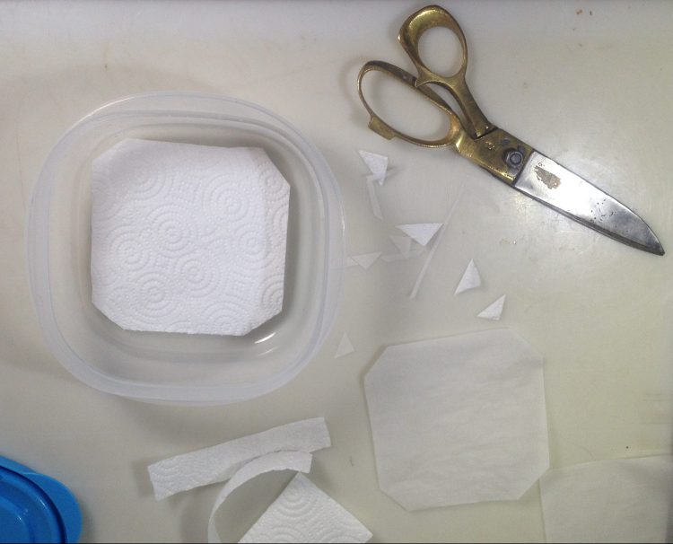 The first thing you'll want to do is cut the paper towel and parchment paper down a size that will lay flat in the bottom of the container. For this exercise I went ahead and measured it out with a ruler, so 4.5 inches fit nicely. I fold the paper towel over to two layers so that it will hold a little more moisture for longer. The walls and corners curve into the floor on this container, so I also cut the corners off the parchment and towel. I cut the parchment paper just a little smaller so that there is a border of paper towel around the edge of it. Note that if you want to get fancy, you can use a sponge cloth instead of a paper towel here, which will do the job a little better and stay moist longer, but will also cost you more to make.