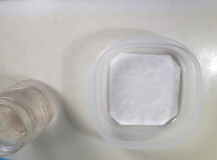 The next thing to do is get that paper towel wet. Not too wet though. In this case I put the towel in the bottom and poured a little water into the middle of it. That it soaked almost to the edges of the towel.