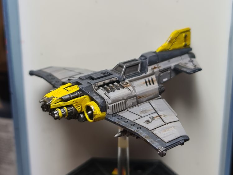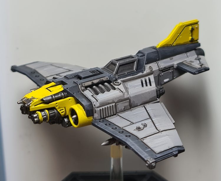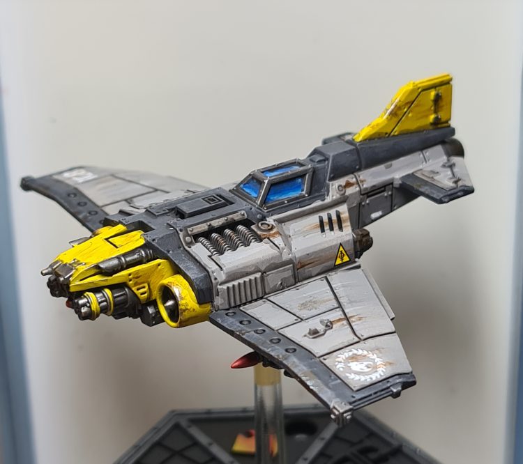 Some quick metallics, and yellow rockets for contrast and they're done. This was a very fast paint job that should be easy to return to when I buy more. I am planning to continue the weird colors with the upcoming Astra Militarum planes, but it'll likely be something different. Orange and teal camo maybe?