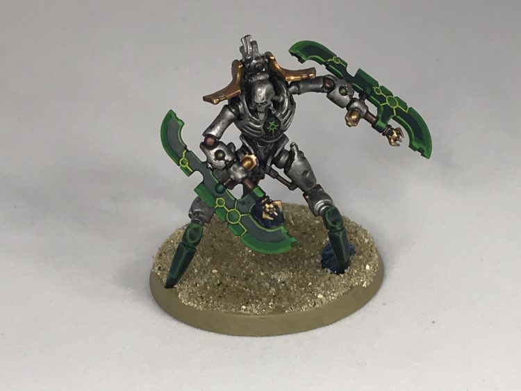 After that, now we're done with any paint applications to wide areas, we finish the legs and blades. The legs get an edge of Moot Green applied via very gentle drybrushing, while for the blades 1:1 Moot Green/Warpstone Glow is used to edge round the back of the weapon, and do a much thicker line on the blade cutting edges. The blades are then finished by a thin edge highlight of Flash Gitz Yellow direct on the blade cutting edge, and an energy glow added to the recesses. To do the latter, I mixed about 2:1 Flash Gitz Yellow and Moot Green and then thinned it down a