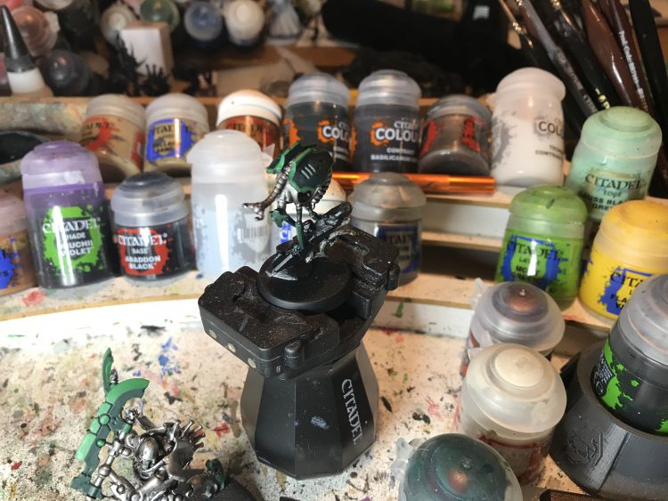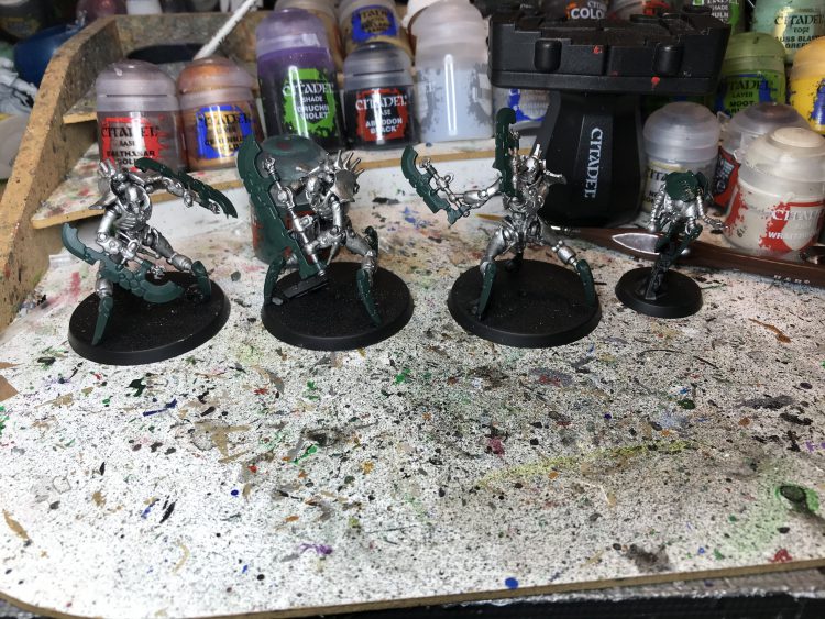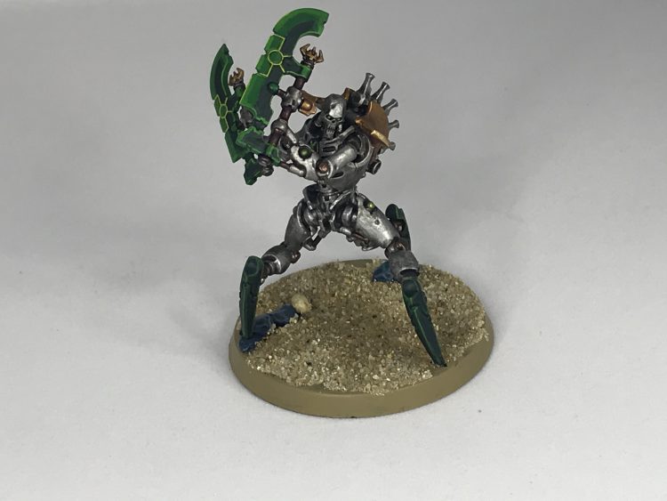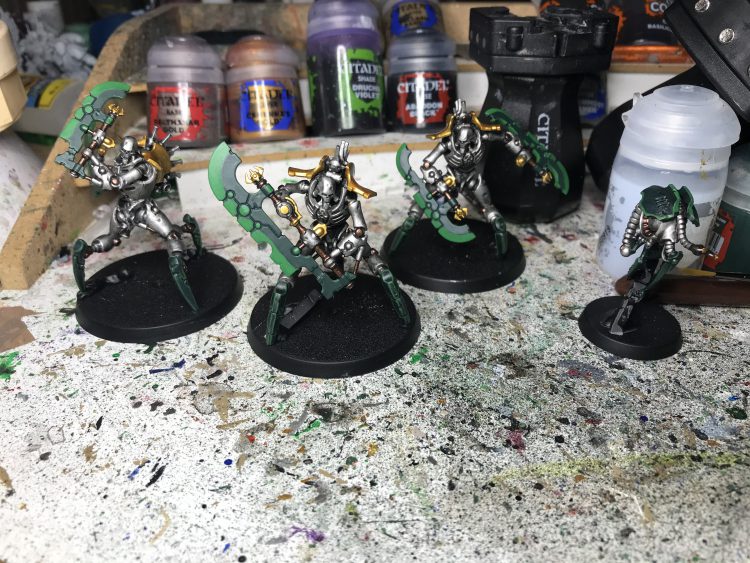 Once that's figured out, I based everything that was going to be metallic in Leadbelcher thinned with Lahmian Medium, and everything Canoptek or an energy blade in Caliban Green thinned with water. Previously when working on Canoptek stuff I've used Caliban Green Spray (now out of production), and what I found here was that CG paint alone was a little bit more of a vibrant green than I really wanted for the base on the legs. Here I salvaged it by darkening down with a wash of Dark Angels Green contrast, for all later models I used 2:1 Caliban Green/Incubi Darkness, which gave what I wanted straight away. Once both are applied, I then apply a layer of thinned Ironbreaker to the silver as well.