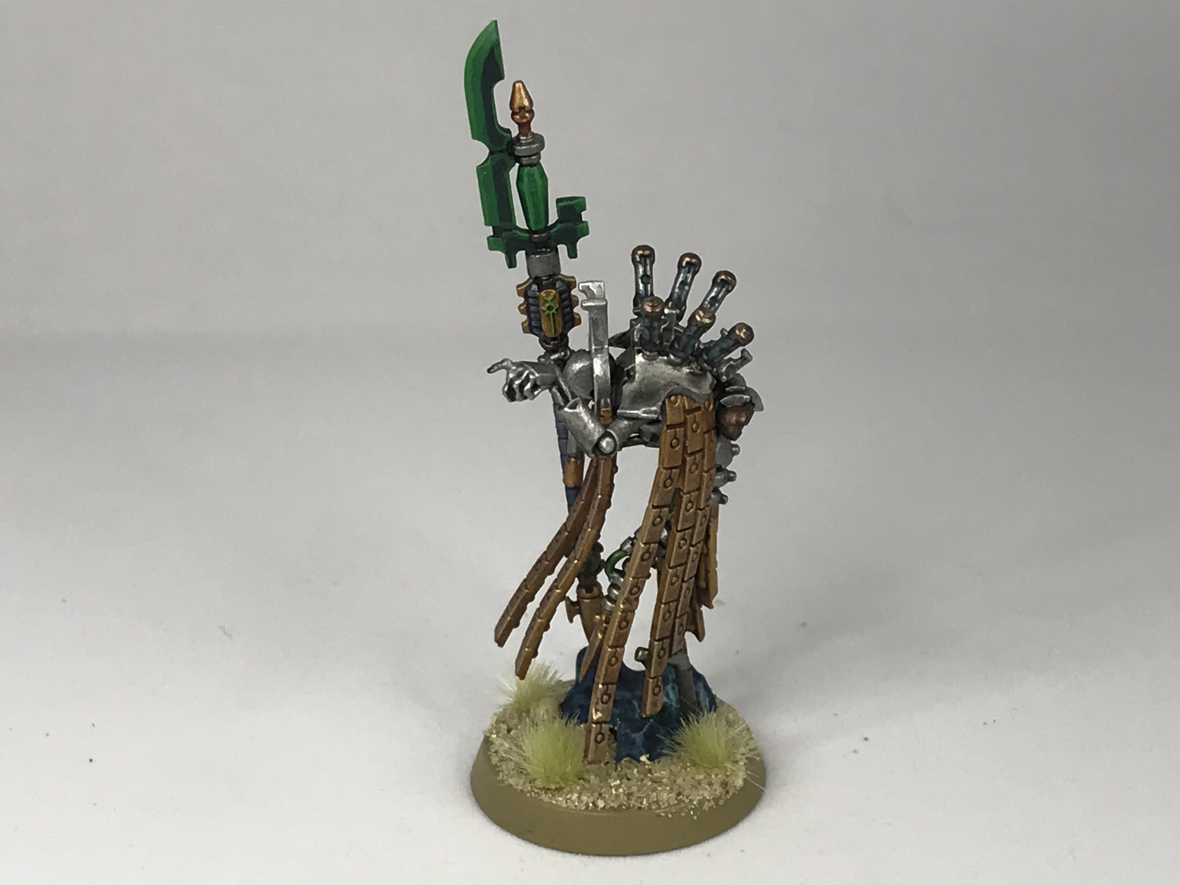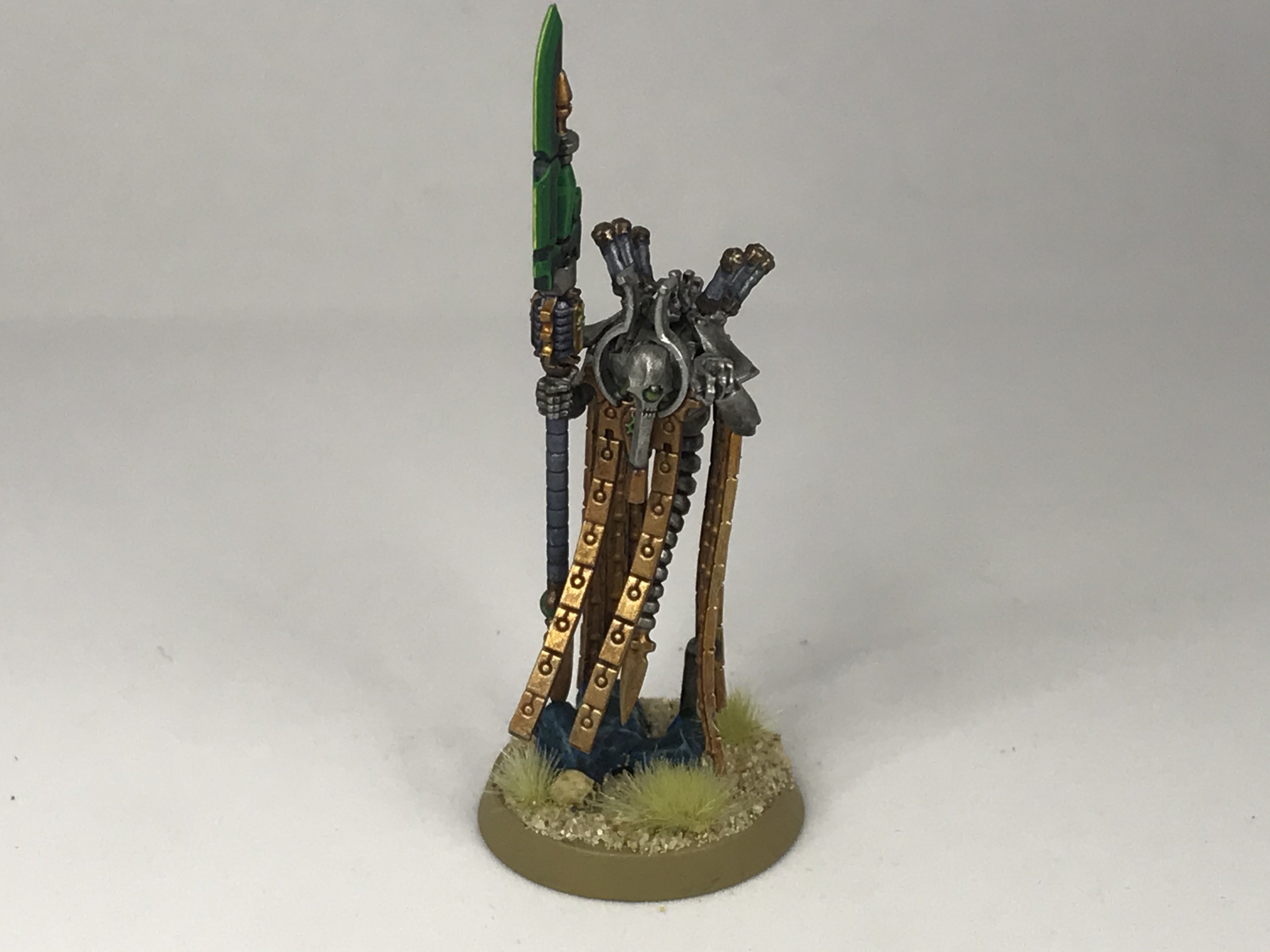 From here we're nearly done. The gold parts get washed with Druchii Violet, then drybrushed with Gehenna Gold and then lightly drybrushed on the edges with 1:1 Retributor Armour/Stormhost Silver. The models have what are clearly "energy orbs" on a few places, so these I hit with Stormhost Silver then thinned Ork Flesh Contrast. For the Plasmocyte, I gave it an evil glowing red eye using Blood Angels Red Contrast over the silver instead. Finally, as these are still non-royalty among the Necrons, they get a black chest runeplate, with the rune itself picked out with Moot Green. A dot of moot green on each of the eyes, and the models themselves are done.