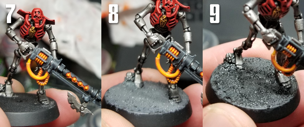 Step 9: Wash the whole thing with Nuln Oil. Once that dries, drybrush it with