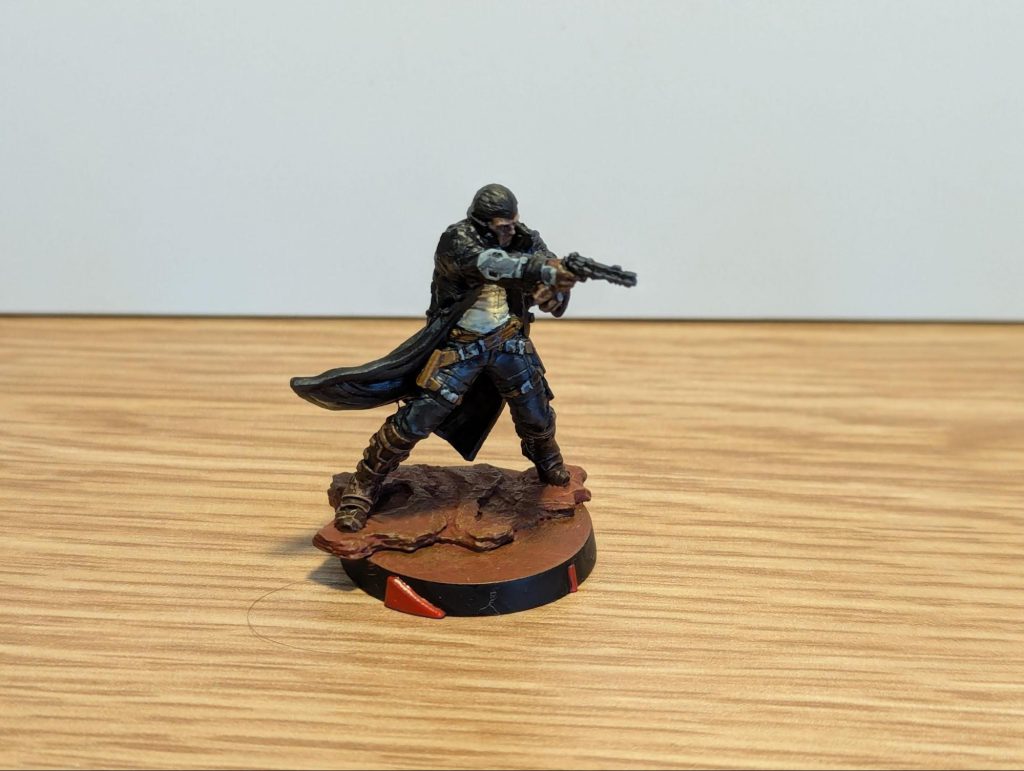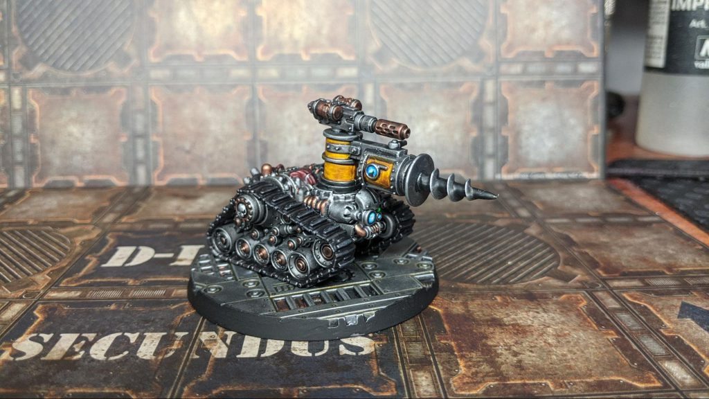 This is weirdly simple and probably not to everyone’s taste, but I think it works well if you bring out texture the right way with the drybrushing, and get the right tone on the basecoat. It can work for a lot of sculpted ‘tactical rock’ type bases and plain base surfaces, because it’s relatively dull and (at least to me) just reads as an oxidised metal background.