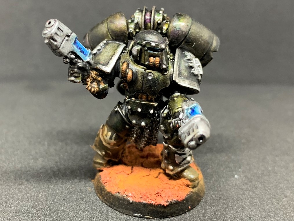 Approaching painting black armor for this I knew I wanted to go for something a little bit different than the standard grey-blue edge highlights, while also not stepping on Condit’s toes painting up the Heresy-style oil slick scheme. I grabbed some of my collection of warmer brown-green greys, and set about playing with using them for my highlights. Sticking with the same theme of warmer colors, I used Scale 75 Thrash Metal as the base of all my silvers, knowing it has a ton of brown in its tones, and a tiny bit of red for my spot colors.