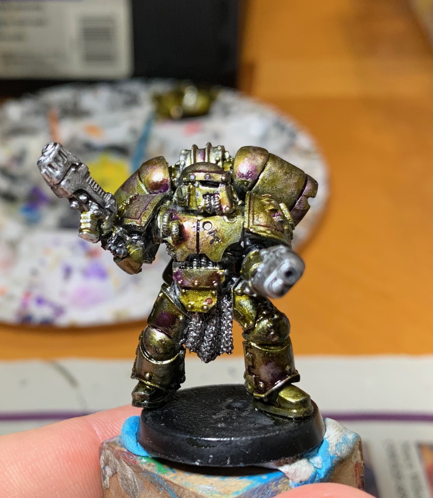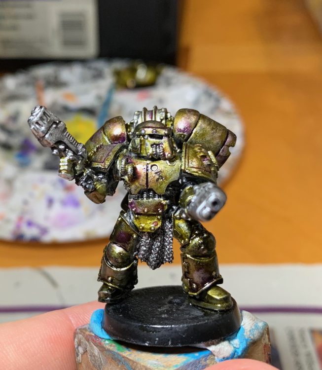 I started with a thin coat of Black Templar Contrast paint over the Leadbelcher. I wanted to darken the metal more, especially in the recesses, but leave a bit of the Leadbelcher showing through on the raised spots. I then brushed on some Seraphim Sepia, Druchi Violet, and Biel-Tan Green in places to get the shimmery oil effect, and then washed the whole thing with Nuln Oil. The result was decent, much quicker than the Tamiyra process, and no bonus headache.