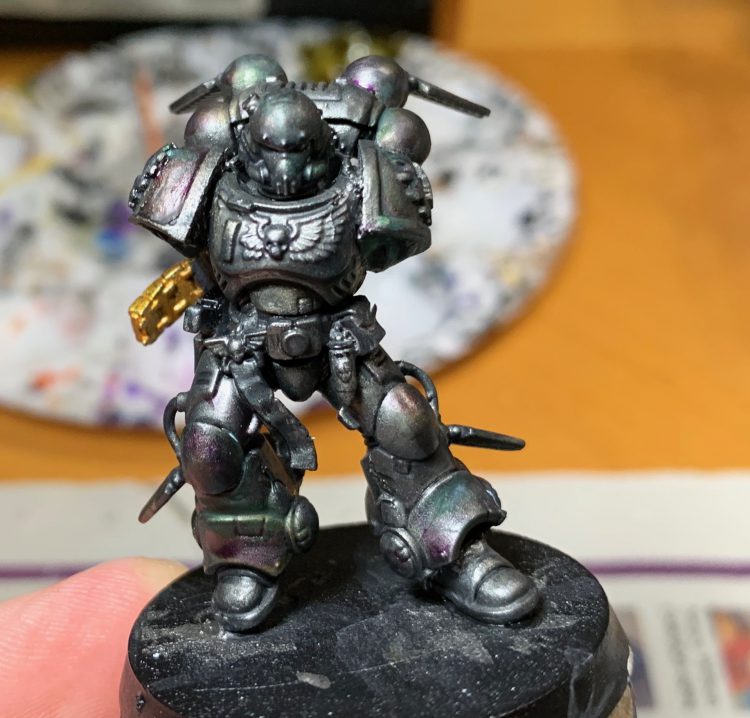 I use both MkIII Tactical Marines and Primaris dudes in my Iron Hands Kill Team. I wanted to use different techniques to call out the difference between the 10,000 year old armor and the fresh- off-the-line Mk X, while still having the oily-sheen-on-black-metal look that shows they are clearly part of the same larger force.