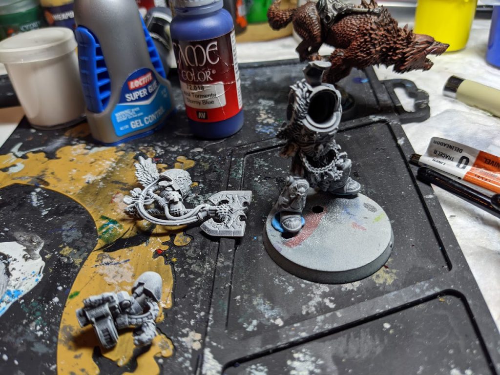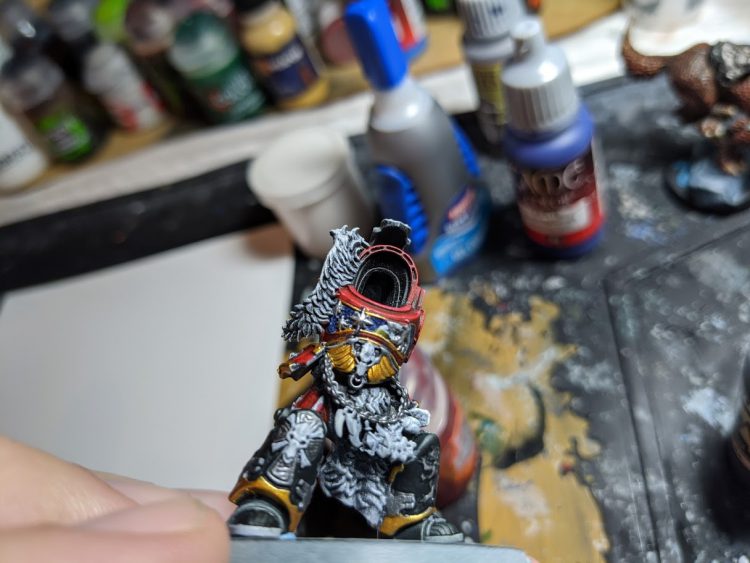 I primed the armored bits (body and arms) in Chaos Black. I primed the head and capey bits in Grey Seer, and set it aside. I then used a smidge of Blu-Tack, and blasted the armor with grey seer from directly above to give a zenithal highlight.