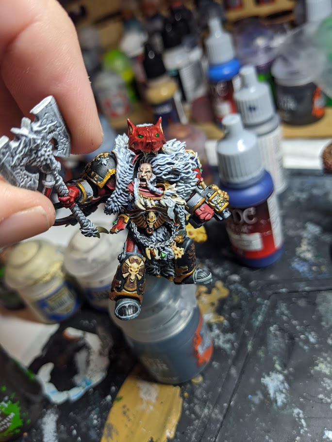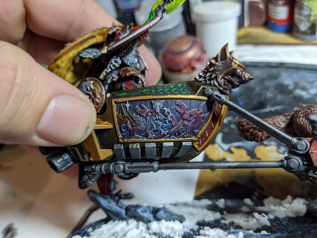The for the various cords linking the axe to his armor, I decided to paint one set of cords white and Blood Angels Red. This gave them something of a candy cane appearance, which again suited my desires for a festive Logan. Another cord was painted in Ork Flesh. Thus, the traditional Christmas colors of red, white, and green. I painted the Axe Haft with Warplock Bronze, and drybrushed with Retributor Armor. The axe head was painted with tesseract glow, then given a progressive drybrush of ulthuan grey and white scar. And with that, Logan was finished. Now, it was time to give him his ride.