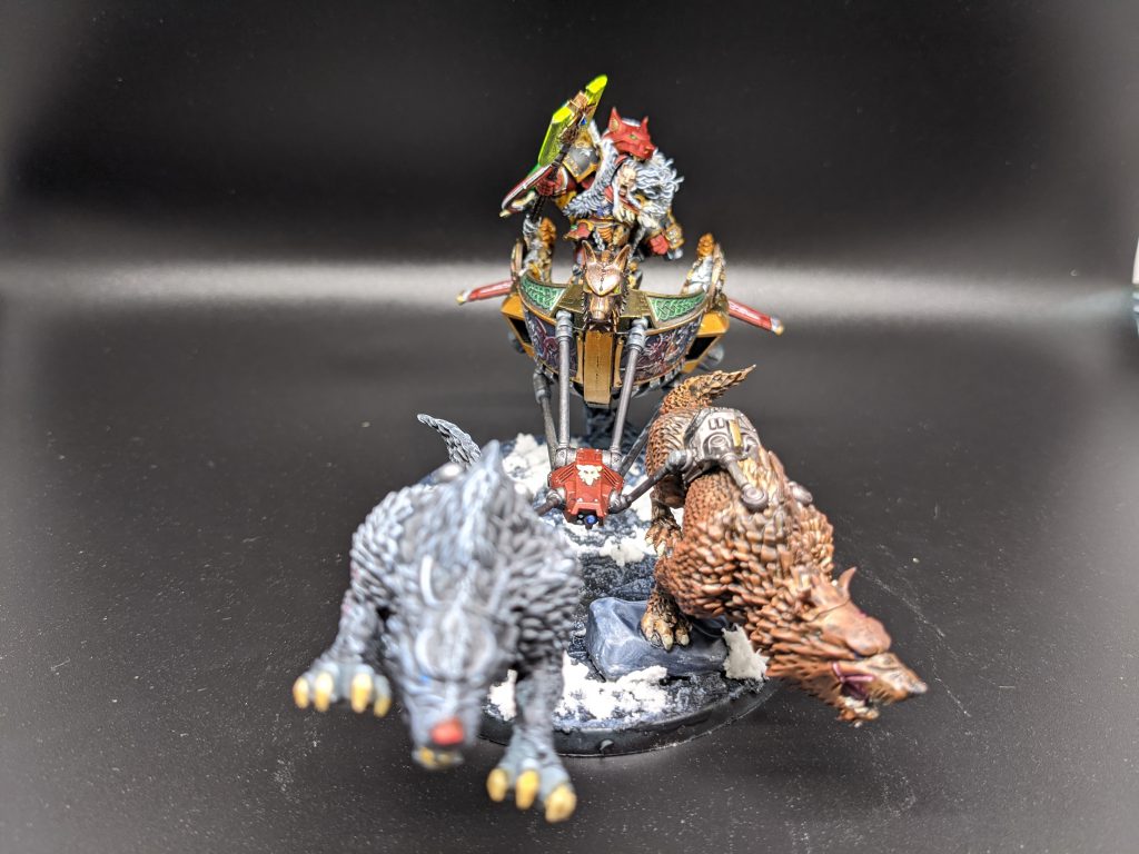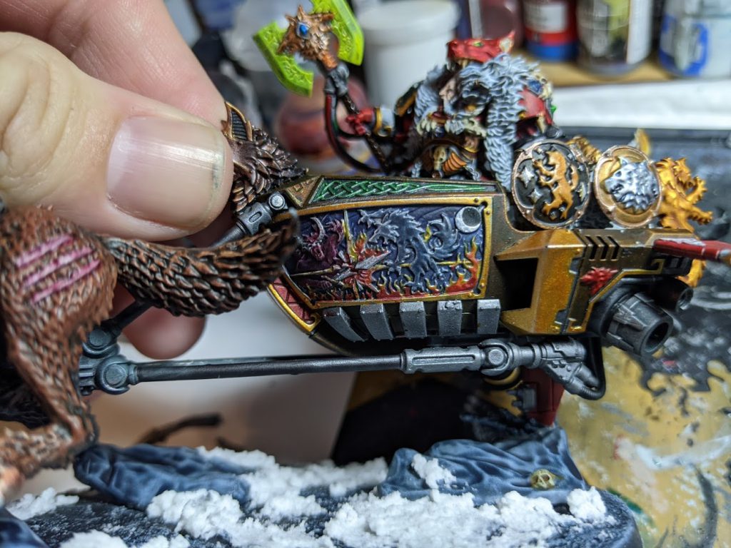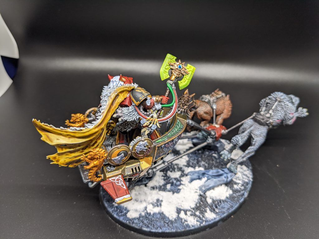 Stormrider is dashing through the snow, a two-wolf open sleigh. It is specifically going through a mound of snow - hard enough to be tall, but soft enough for a sleigh to hover through. I painted his Space Wolves Grey.