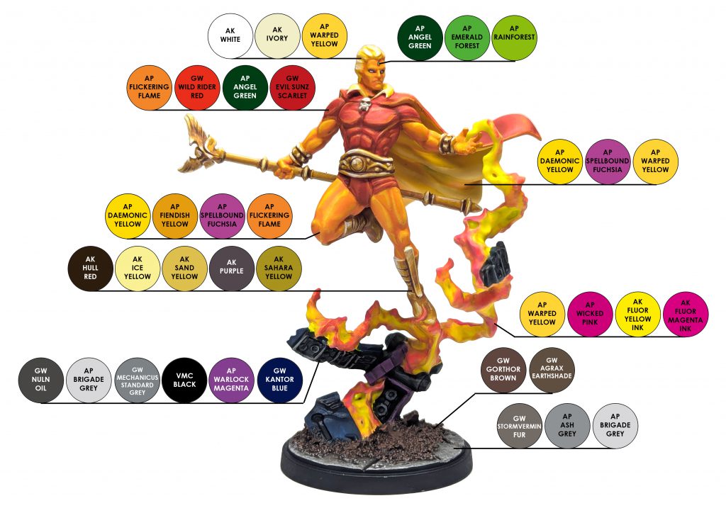 The interior of his cape is a bright yellow, but since its not catching direct light we won't be going crazy with the highlights either. To get the color we are aiming for I start with Daemonic Yellow as a basecoat over white.