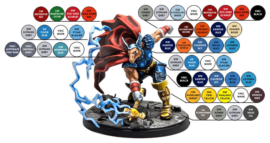 Beta Ray Bill's character model takes inspiration from the cover of his debut issue, The Mighty Thor #337. Its a really cool pose, but it can be a little awkward to reach into some areas of the model, especially inside his cape. To make it slightly easier to reach, I would suggest painting the interior of his cap and back before assembling him to a base. Below you will find the chart of colors I used for each area of Bill's model. Let's get cracking.