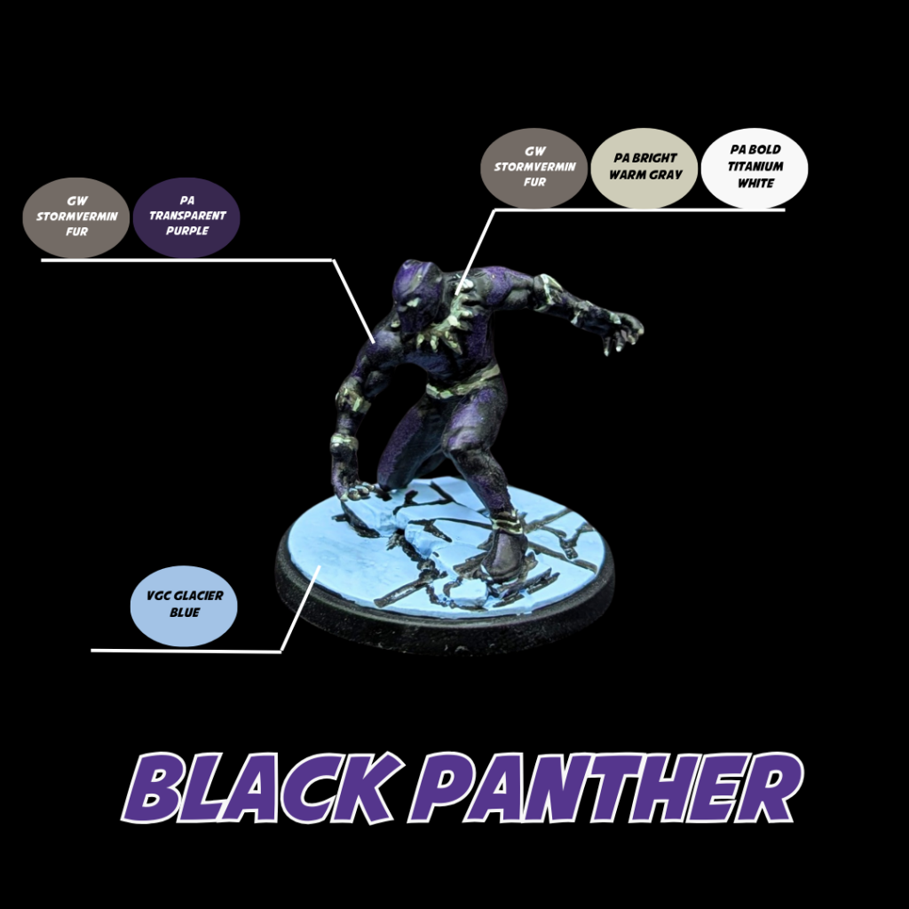 - I finished up T’Challa by painting his base with Vallejo Game Color Glacier Blue and using Black Ink to line both the base and the model.