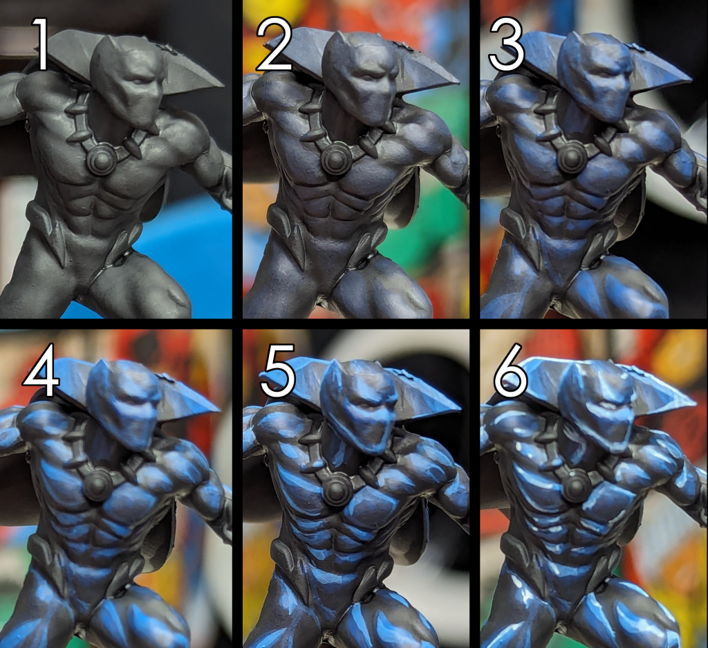 I find black suits to be a chore, most of the time. They can be a struggle and compared to the bright colors of some other heroes, they can seem uninspiring. But that doesn't mean we can't try our best and make things look interesting. For this one, I'm using Kantor Blue and Teclis Blue to add visual interest to it, while highlighting up to Ulthuan Grey for our final highlights.