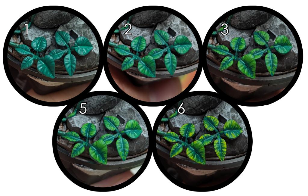 For the greenery, we are going to go with a bit of a blue-green for the base color of the vines and leaves. For that we'll start with a mix of Warpstone Glow and Thousand Sons Blue, then we'll start mixing in Flash Gitz Yellow for the subsequent highlight layers, finally finishing it off with straight Flash Gitz Yellow.