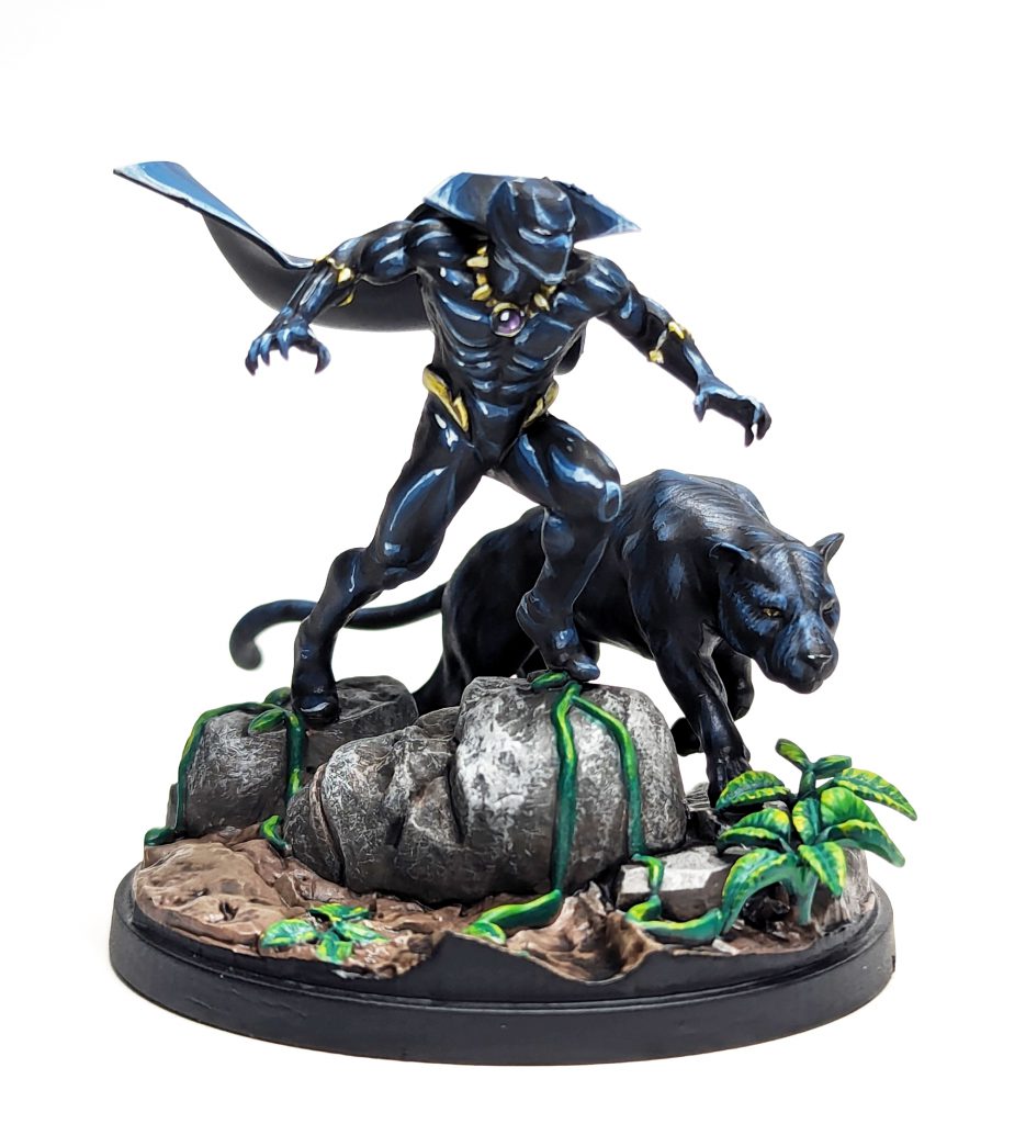 we've already reviewed here) and he's the focus of this How to Paint Everything. In this one we'll go over how I painted his black suit, painting the non-metallic gold jewelry and the purple gemstone in his necklace as well as the fur on his panther buddy and the foliage on the base.