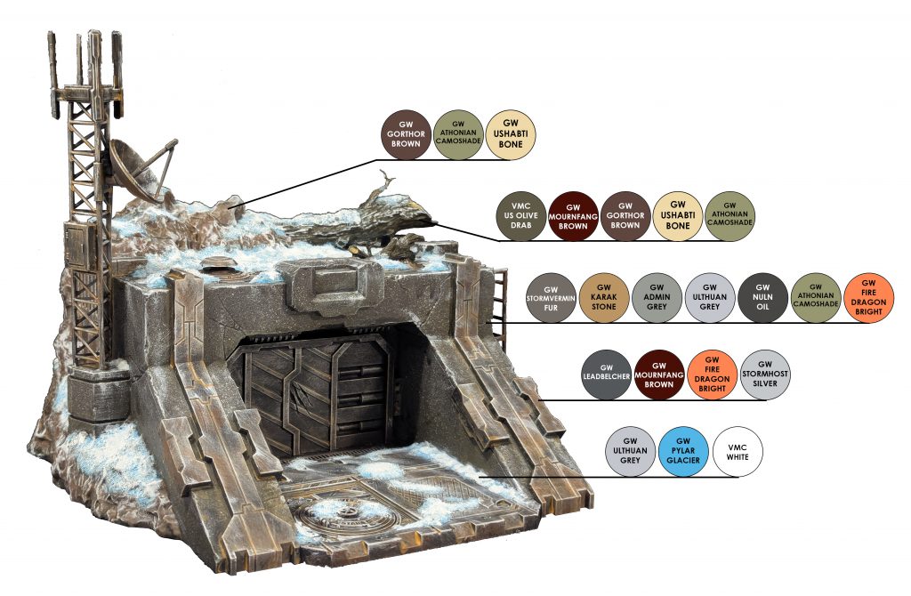 All of the concrete sections were painted with a basecoat of Stormvermin Fur, I then broke out the toothbrush and started flicking Karak Stone, Administratum Grey, and Ulthuan Grey on it. After I was happy with the coverage of the speckles I washed the entire model down with Nuln Oil. With the Nuln Oil dry, I then drybrushed all of the concrete areas with Ulthuan Grey. To add some visual interest, I added surface staining with Athonian Camoshade and thinned Fire Dragon Bright.