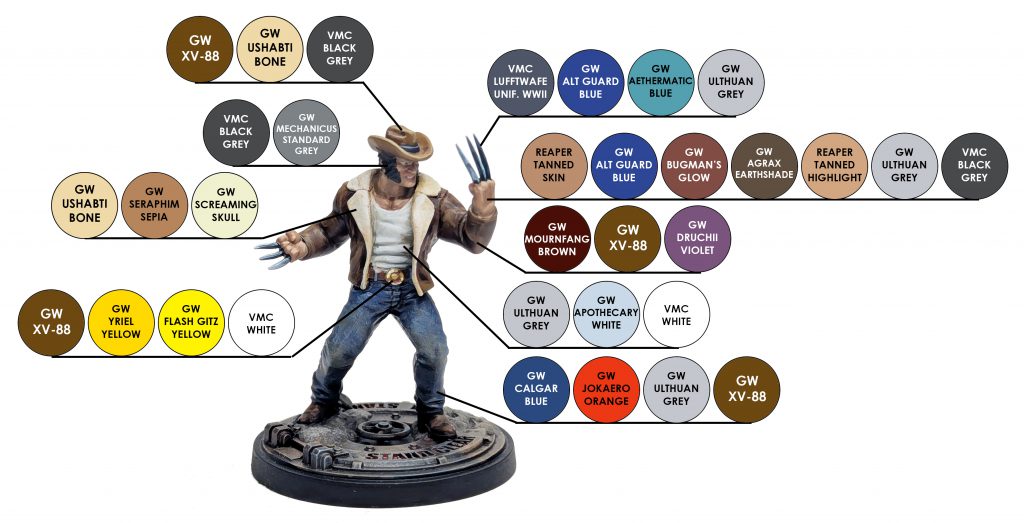 Blonde hair has always been a struggle for me, but I think it worked out really well on Sabretooth. I started with a basecoat of XV-88 and a layer of Zamesi Desert. I then highlighted it with a mix of Zamesi Desert and Ice Yellow, finally another highlight of Ice Yellow.