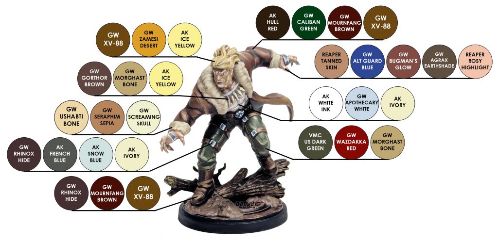 The fur on Sabretooth's coat was painted the same way as Logan's was done. Starting with a basecoat of Ushabti Bone, a recess wash of Seraphim Sepia and then highlights of Screaming Skull.