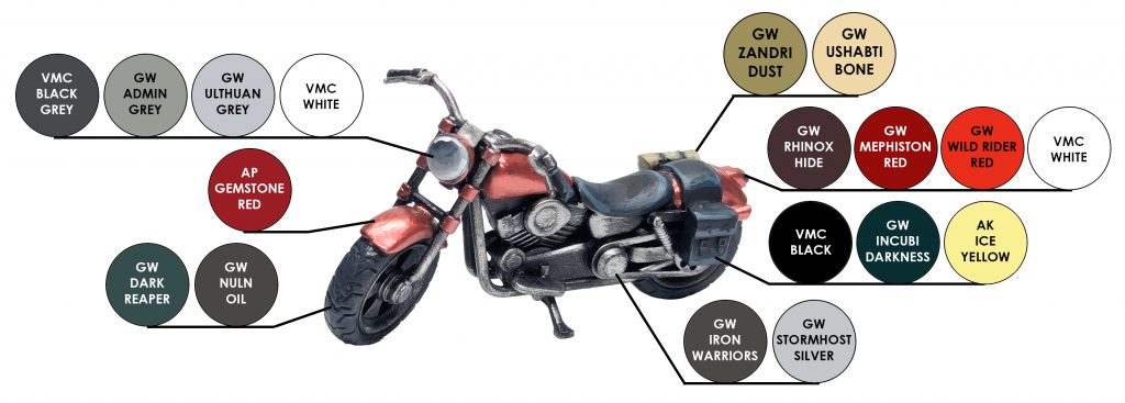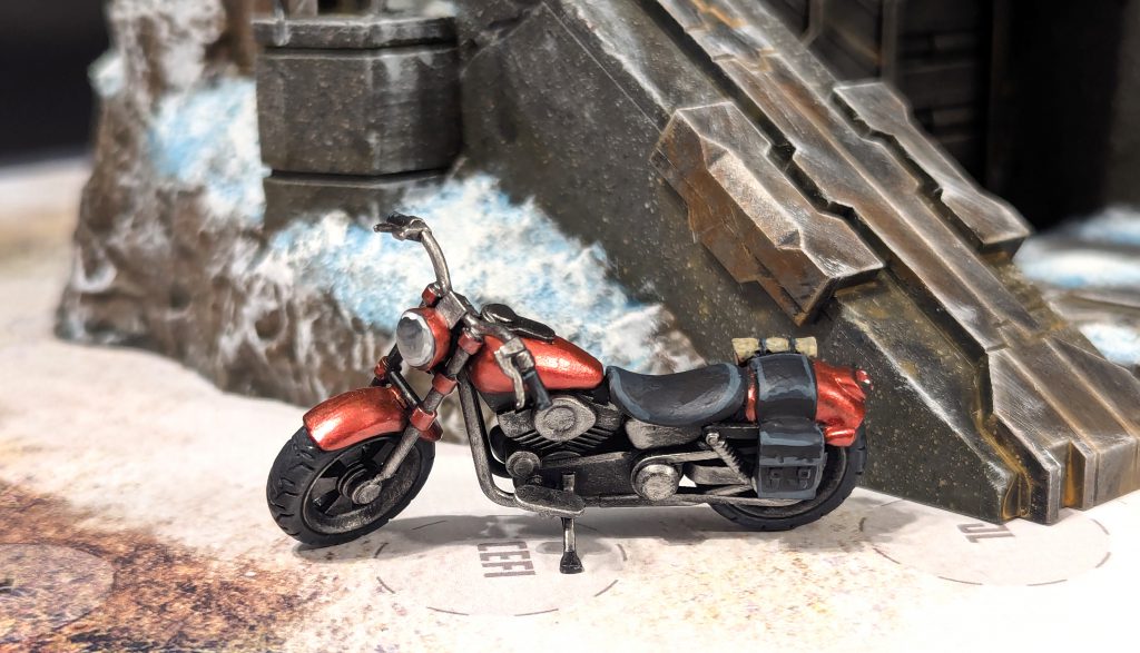 Over a black primer coat, I drybrushed the entire bike with Iron Warriors and Stormhost Silver.