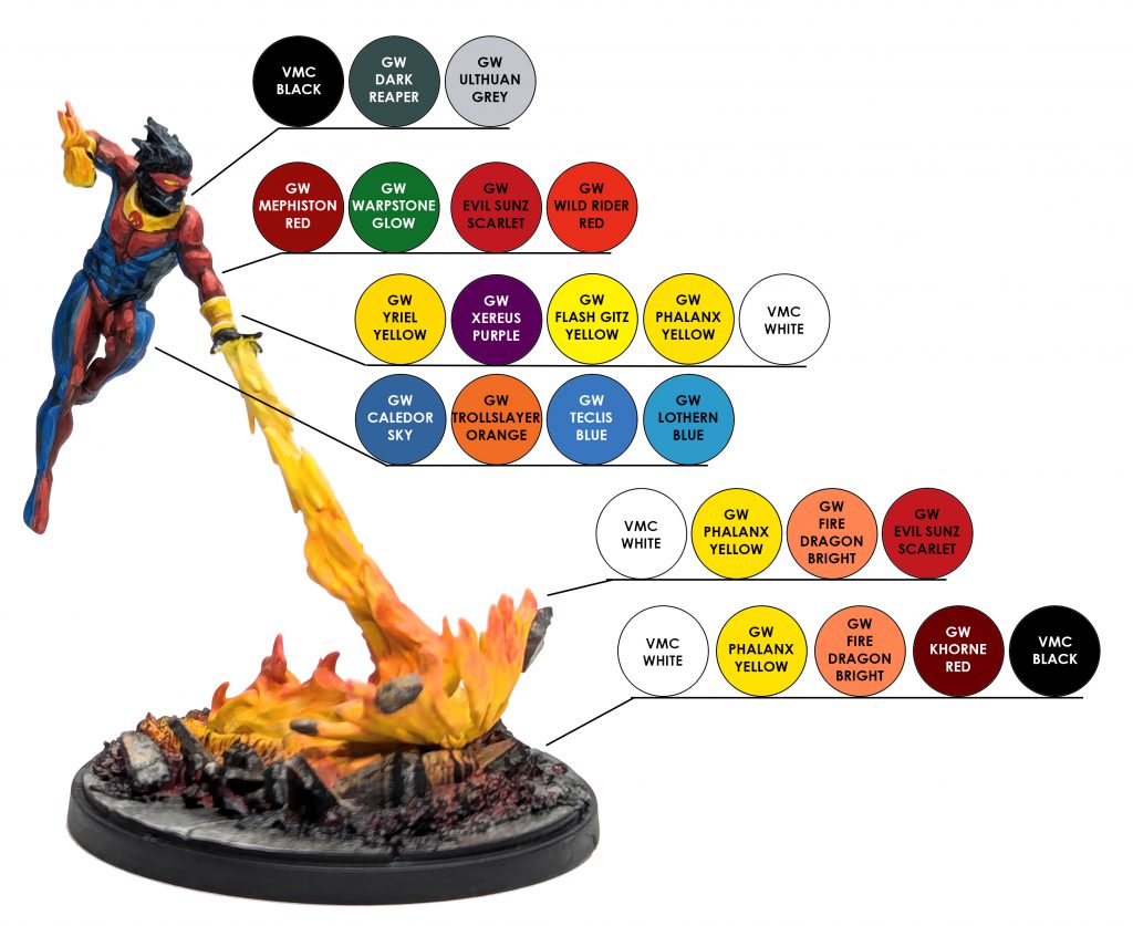 We're going to be painting the flames for Sunspot basically the same way I did it for the Dark Future Terrain Pack. It consists of 3 colors over white and its how I paint 90% of the fire fore my Marvel: Crisis Protocol miniatures. From a White Basecoat, add a layer of Phalanx Yellow. While the yellow is still wet, paint on Fire Dragon Bright, starting at the top and letting the two paint mix together as you work. Finally, while the orange paint is still wet, paint Evil Sunz Scarlet from the top down and let it mix with the orange a bit. Touch up as necessary while its all still wet.