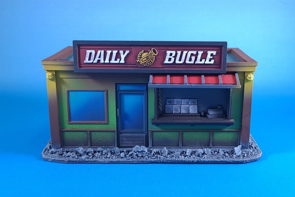 Daily Bugle stand for Marvel Crisis Protocol terrain painted by Crab-stuffed Mushrooms