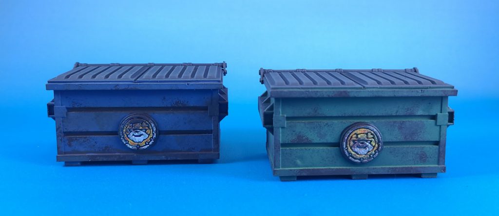 - Basecoat the dumpsters with Kantor Blue or Caliban Green.