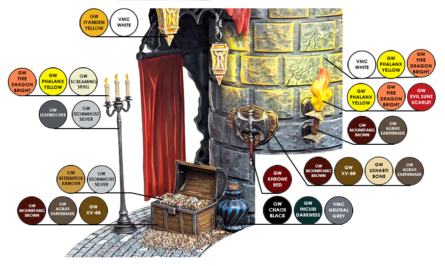 The torch on the wall was painted by drybrushing the sconce with Leadblecher, the torch itself was painted with Mournfang Brown and washed with Agrax Earthshade. I painted the flames the same way I've shone them done previously, which was a basecoat of white, a layer of Phalanx Yellow, followed by Fire Dragon Bright and Evil Sunz Scarlet.