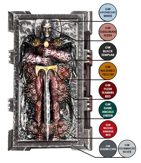 The Sarcophagus was first given a drybrush of Leadbelcher and Stormhost Silver. I then used Citadel's Contrast paints to apply color onto the sculpture of Dracula. This allowed the metallic flakes of the silver to show through. Once the Contrast colors were all dry I hit it with another drybrush of Stormhost Silver to give it a worn appearance.