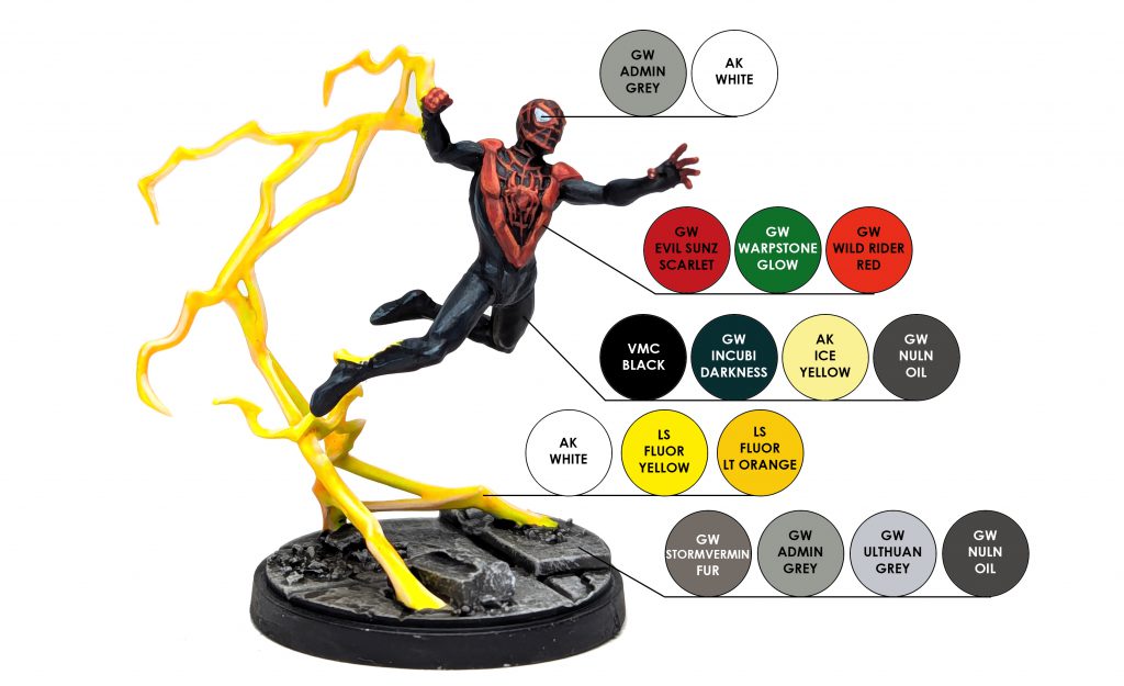 Mile's suit was painted how I usually paint black suits, which starts with a basecoat of Black mixed with Incubi Darkness. From there I mix in more Incubi Darkness and start defining musculature and areas that need to be highlights, before switching to straight Incubi Darkness. I then mix in Ice Yellow to Incubi Darkness to brighten it up a bit and begin highlighting the muscles and any raised areas. Mix in more Ice Yellow to highlight it more, repeat as needed. Then, wash the suit with Nuln Oil.