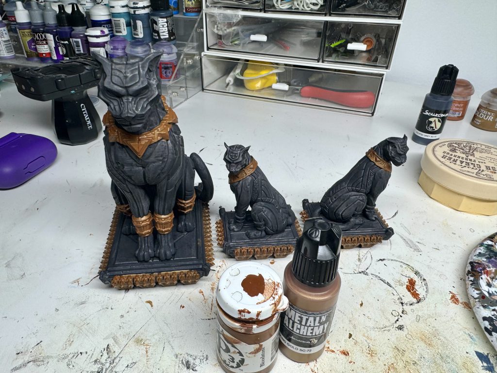 Anyway. I started with the three panther statues by doing a relatively thin application of Scale75 Eclipse Grey with my biggest brush. Play with the amount of thinning here to your liking. I wanted it just thin enough that raised surfaces would come out noticeably lighter than the rest.
