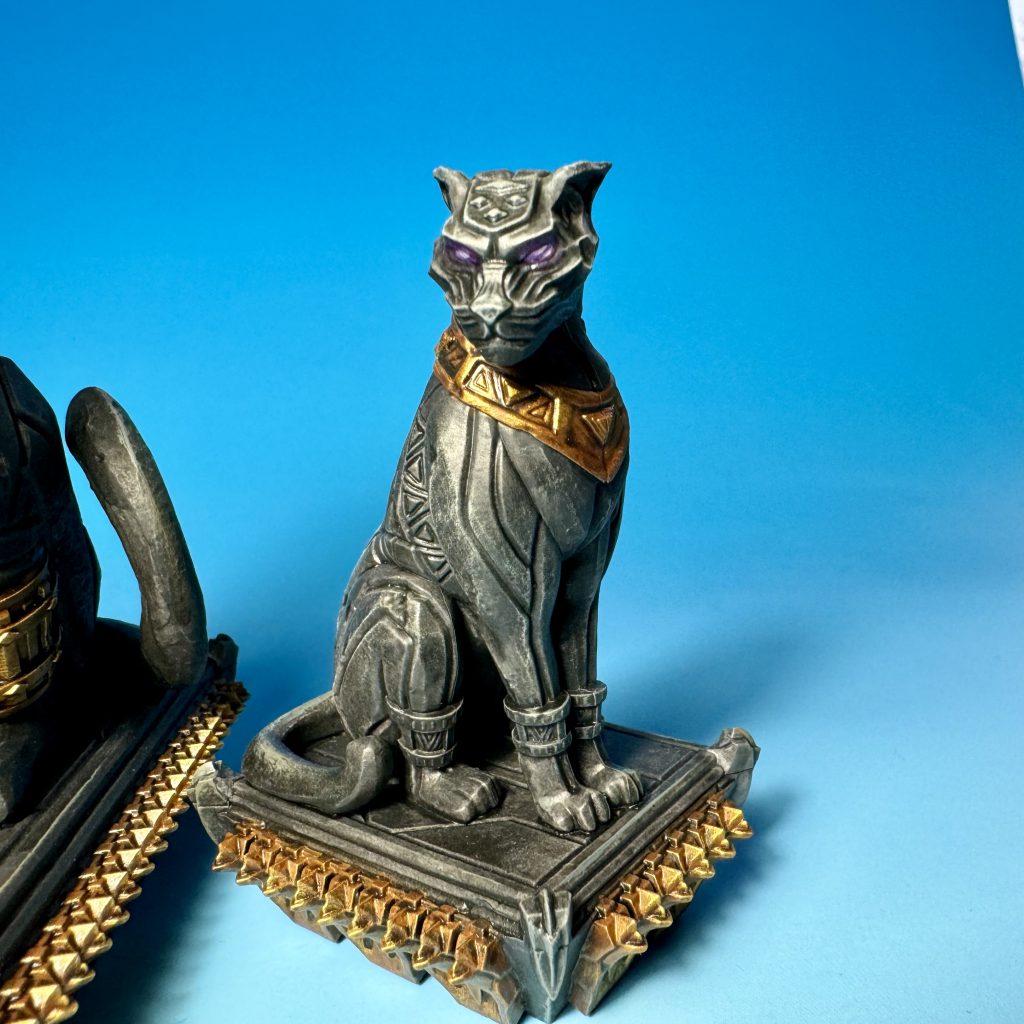 Once the metallic areas were done, it was just some cleaning up to do here and there and the statues were done. I did go back a day or two later and add a quick glow effect to the eyes of the smaller statue. I used some purples which looking back at my notes…I did not write down. My best guess is a base of Army Painter Alien Purple, including drybrushing that shade wherever I wanted the glow to hit. Then a smaller layer of some GW Genestealer Purple on the eyes, followed by a dot in the center of Genestealer mixed with an off-white such as P3 Menoth White Highlight. (MWH is the GOAT of off-white paints and my favorite mix-in for making lighter shades.) This was all a little nod to the optional special rules that came with this terrain. (I will probably never use said rules but painting them in regardless of that fact is extremely on brand for me.)