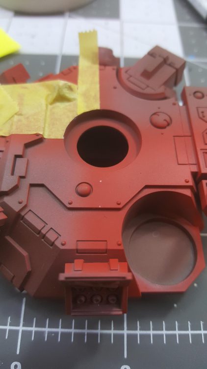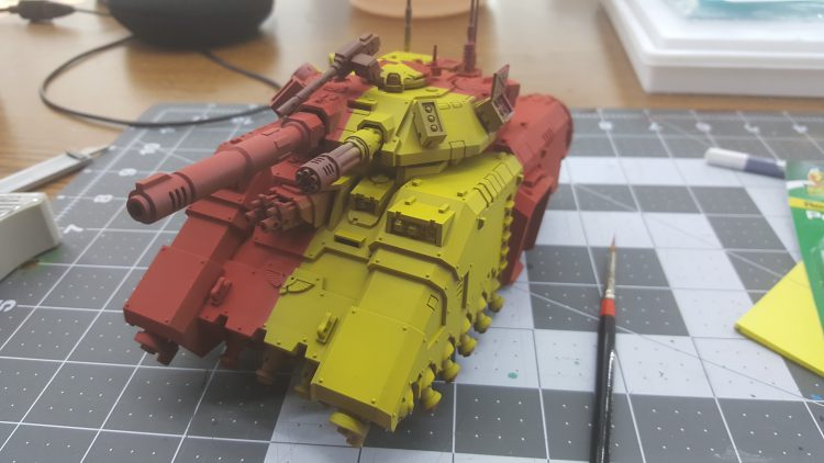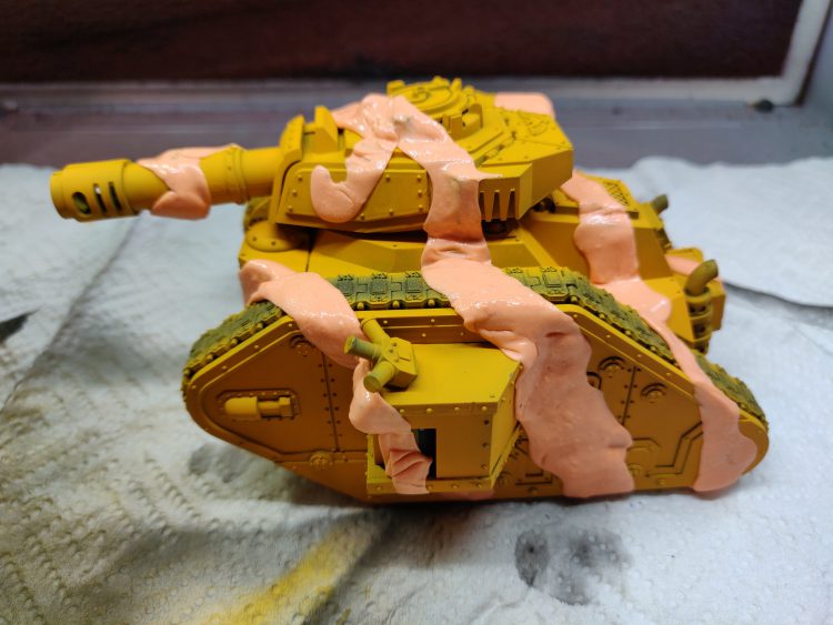 To start with, I primed everything black and then applied a base coat of Averland Sunset. It's generally easier to start with your lighter color and then apply the darker one over that for the easiest coverage, though with the Citadel Base paints that's less of an issue. Next I pulled and flattened the putty into rough bands and pressed them across the tank, trying to work it into the cracks wherever possible. While this method is great, it's not going to give you perfectly crisp and clean lines when you are finished, so take that into account.