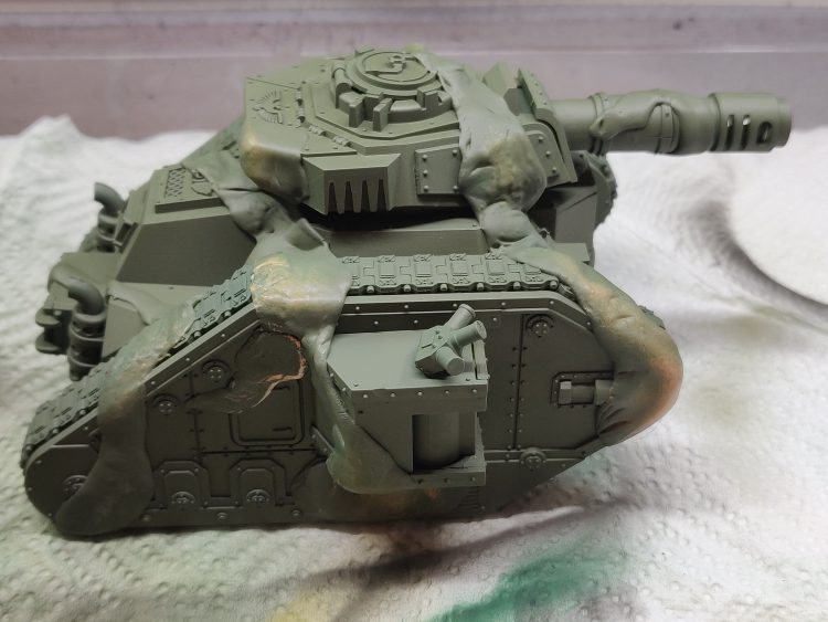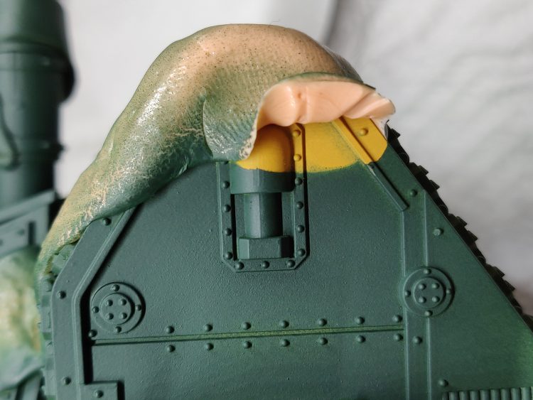 Here you can see some of the 'fuzzing' you get with this method. Having decided to try something else for the green, it was simple to push the putty back on and then apply a coat of Castellan Green.