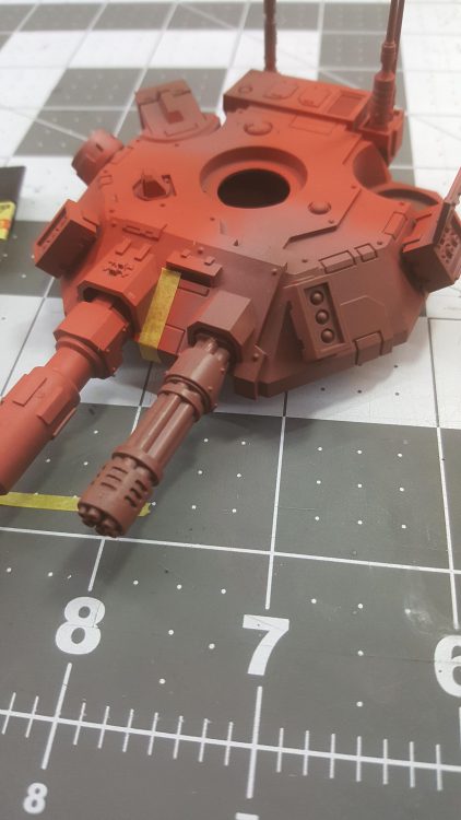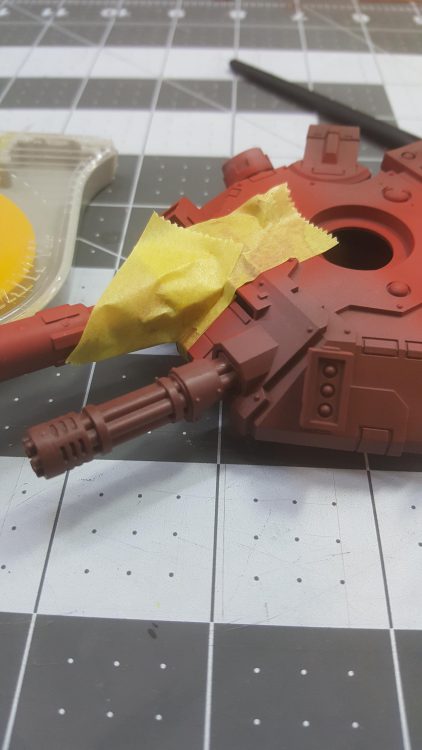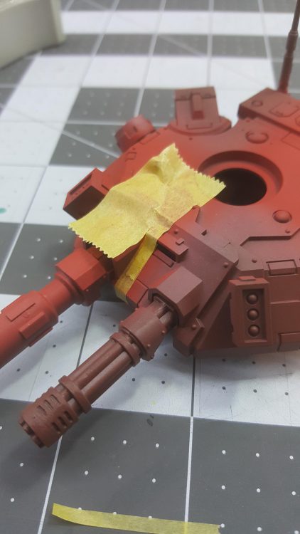 Next, using the marks as references, the outermost edge is defined with masking tape. This will be the most important place to get right to avoid color bleeding, so take your time to make sure the alignment is how you want it, to work into crevices as best as you can, and to get your tape completely flat against the model as any bumps or gaps will require cleanup later. You may find it easiest to slice off a smaller piece of tape to begin with so that you are encountering as few hindrances as possible.
