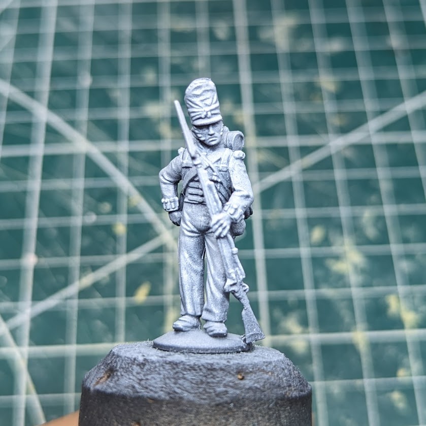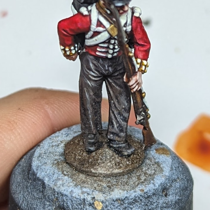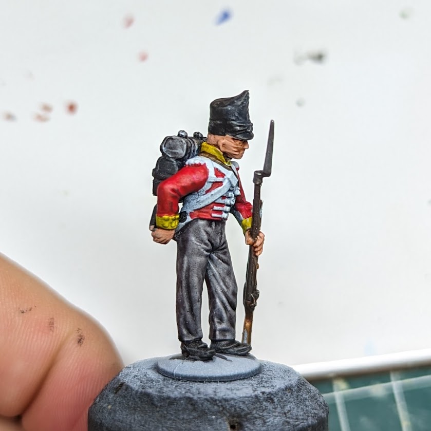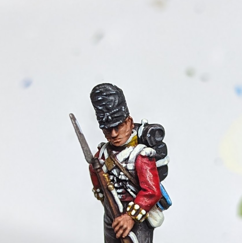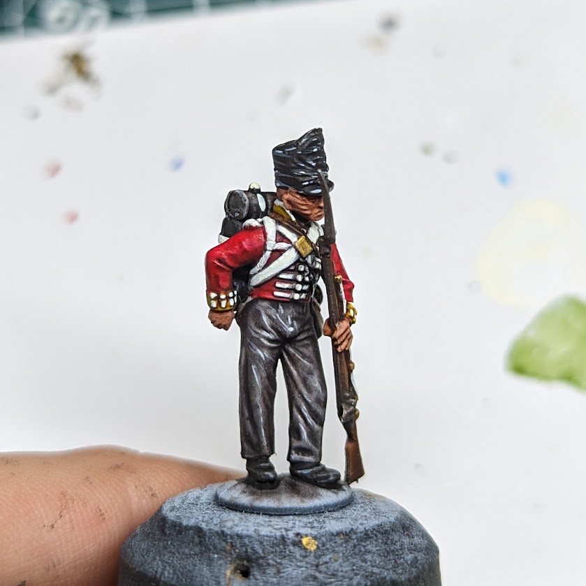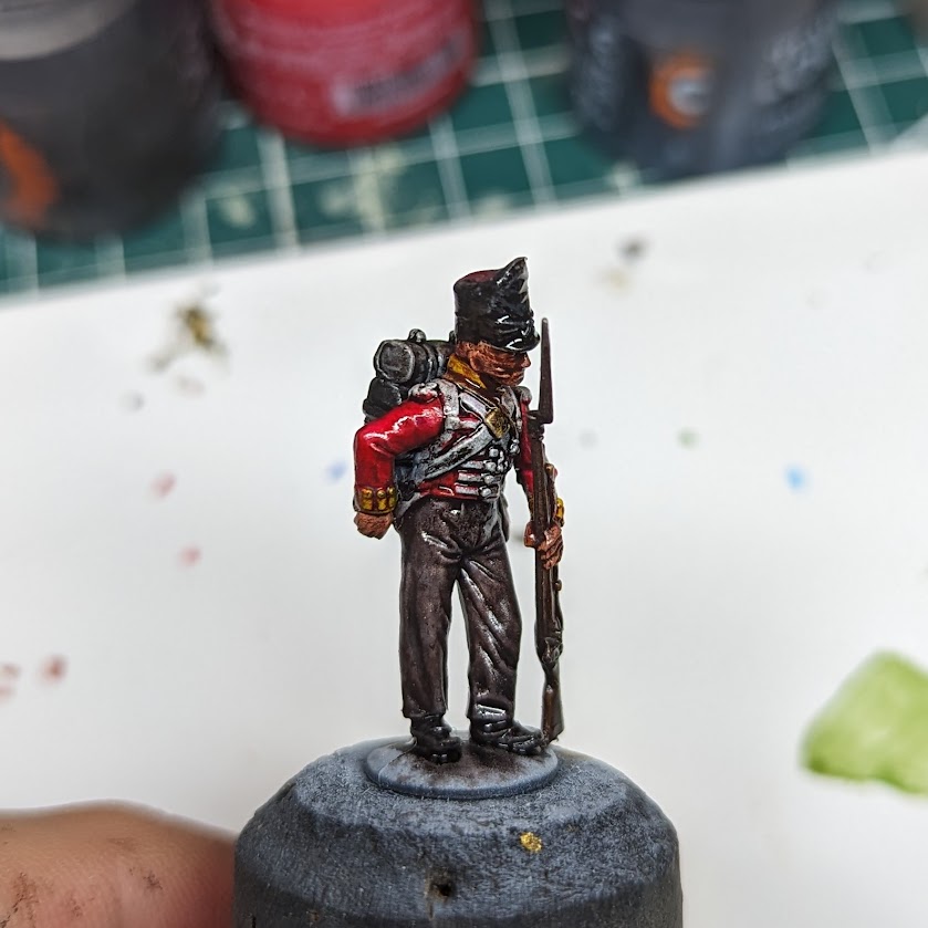 - Black and grey areas - use the same mix as above but add a bit more water or glaze medium. This time, keep it subtle at one, perhaps two, quick passes. I overdid it on the trousers and shako and the material started to look too ‘glossy’, so I applied a very thinned down wash of basilicanum grey with some matte varnish to mute things down.