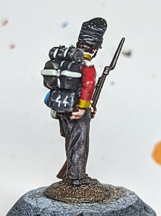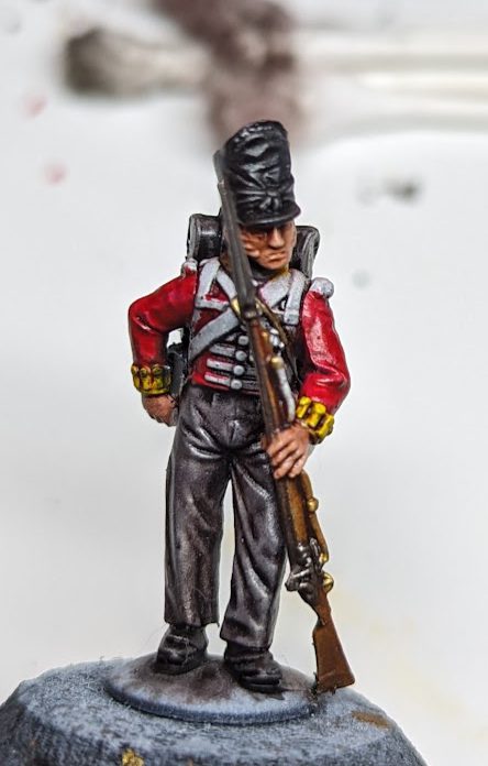 - Metalwork - highlight the musket, bayonet, cooking pan and water bottle cap with Vallejo Metal Colour dark aluminum.
