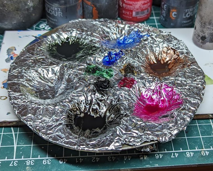 - Mix your washes in a palette with little cups, or some other container. Oils dry really tough (all that art that is still about from centuries ago) so line it with aluminum foil to make clean-up easier.
