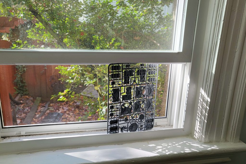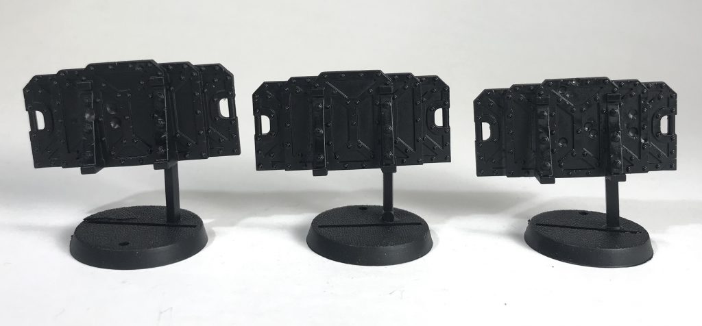 For painting these Kill Team barricades I have cut a straight piece of sprue and superglued the barricade to a round base so I could use my painting handle. They are primed black.