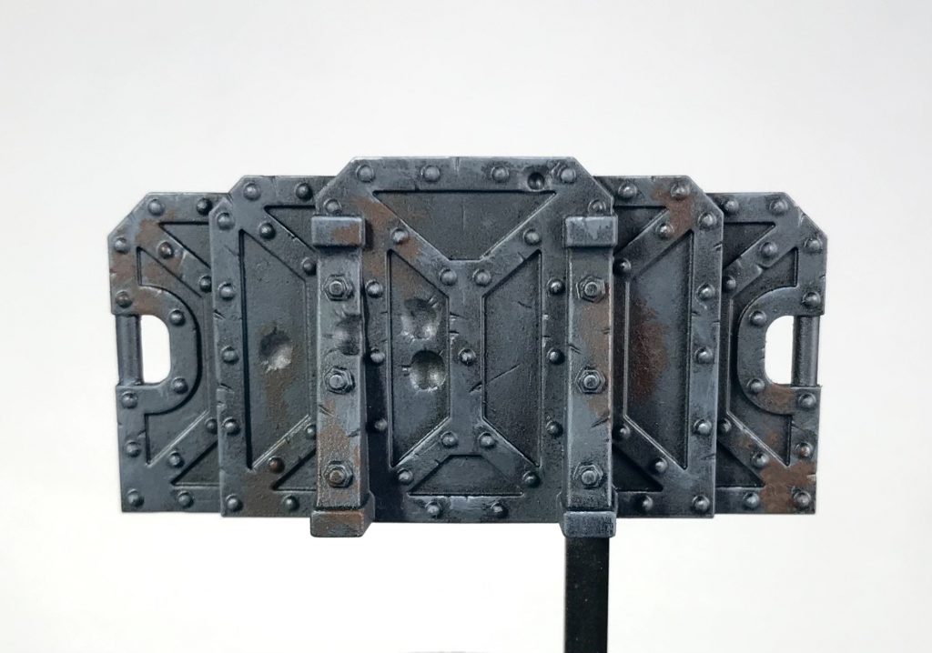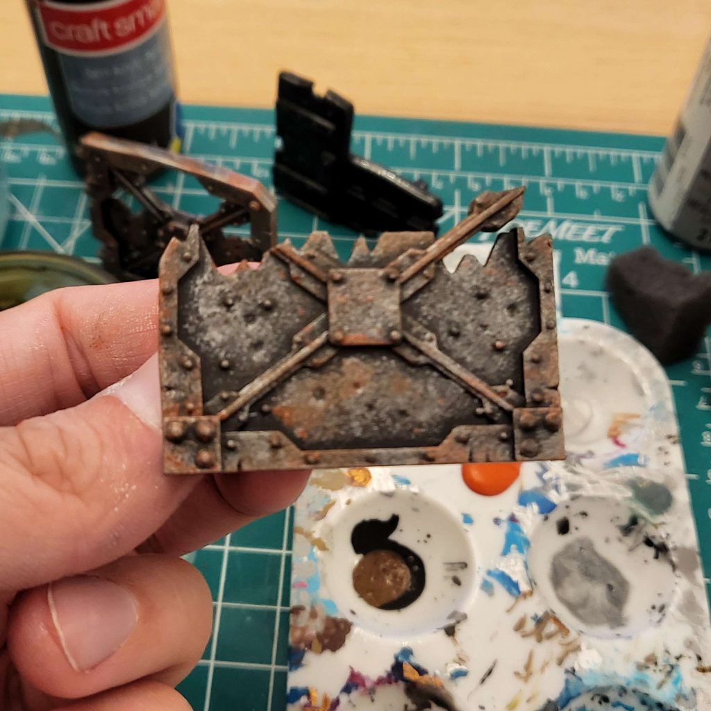 Step 2, sponge the terra cotta on a decent amount of the barricade, focusing on rivets, some flat areas, and low spots.