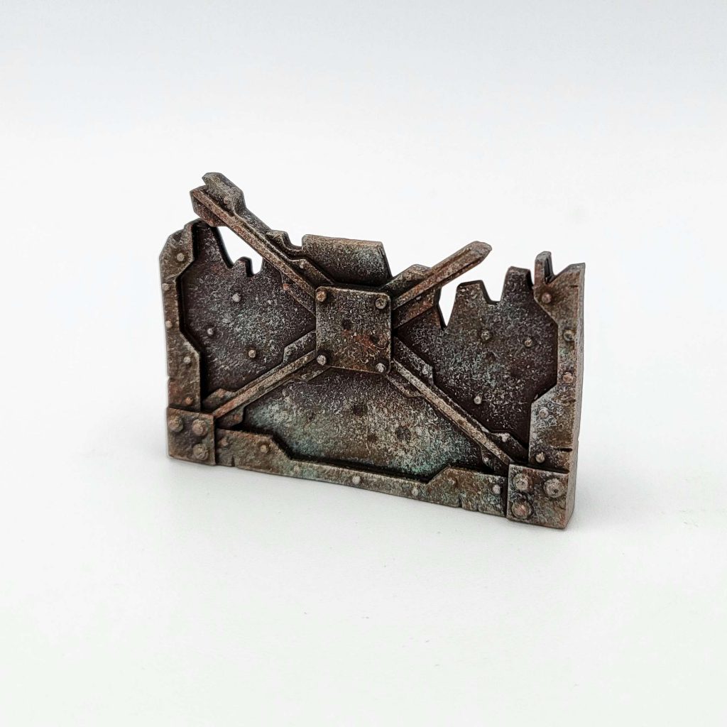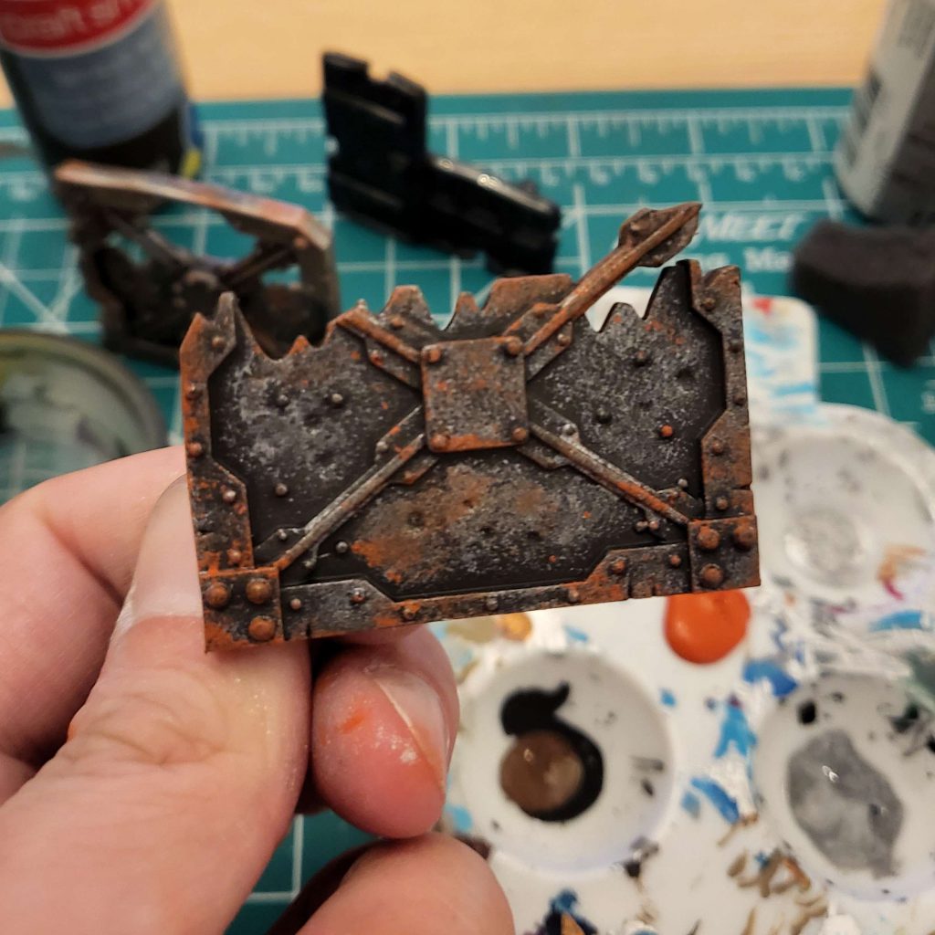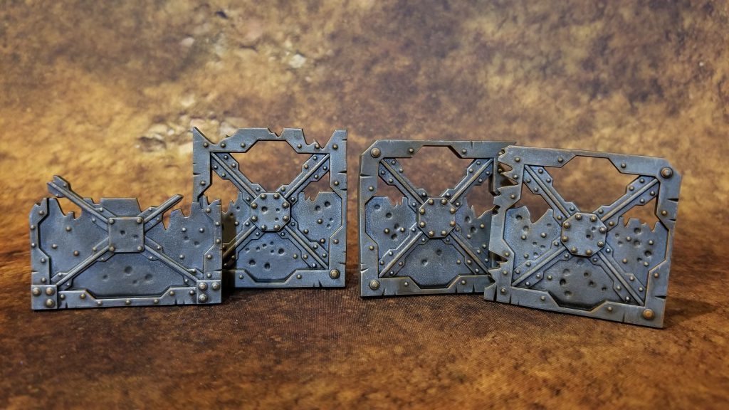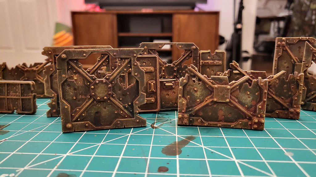 Both of these methods use the same end process of oil washes to achieve their rusted, grimy finish. More time is spent in spraying and prep than in sit-at-your desk painting time. Like all my terrain, it’s a low effort, high reward effect.