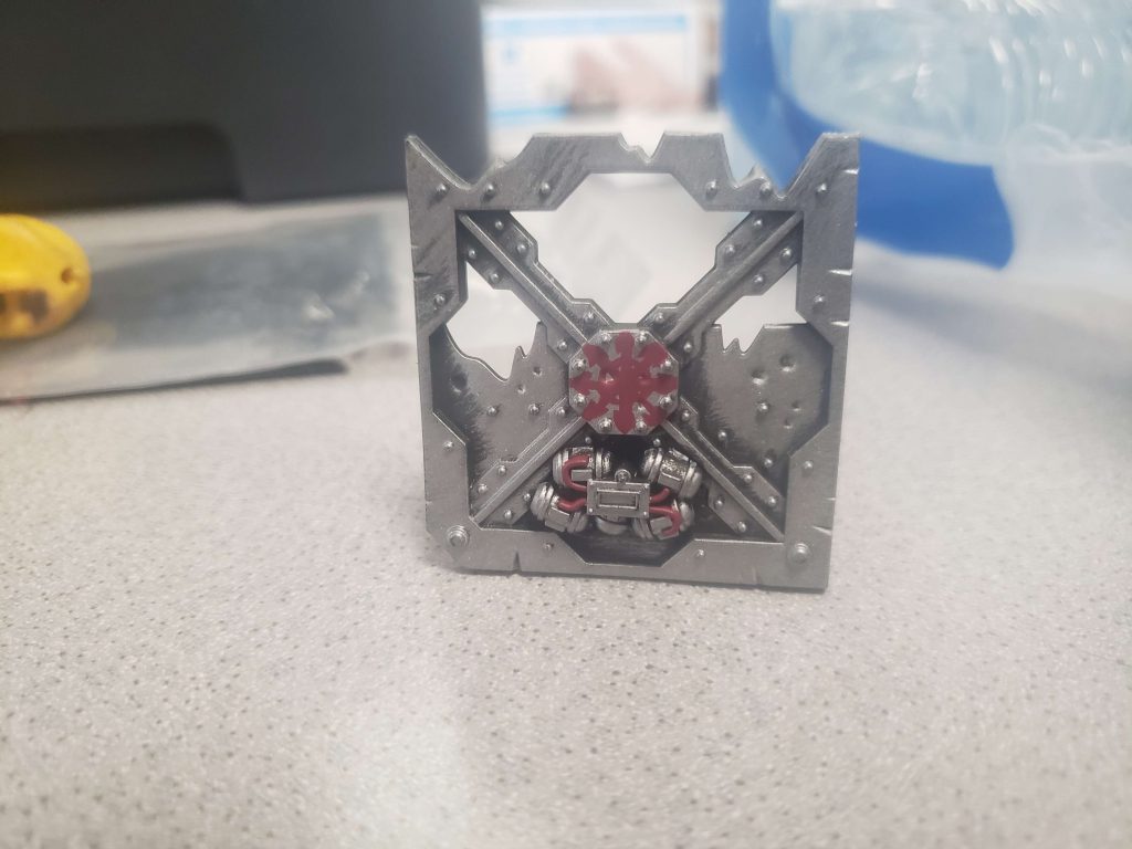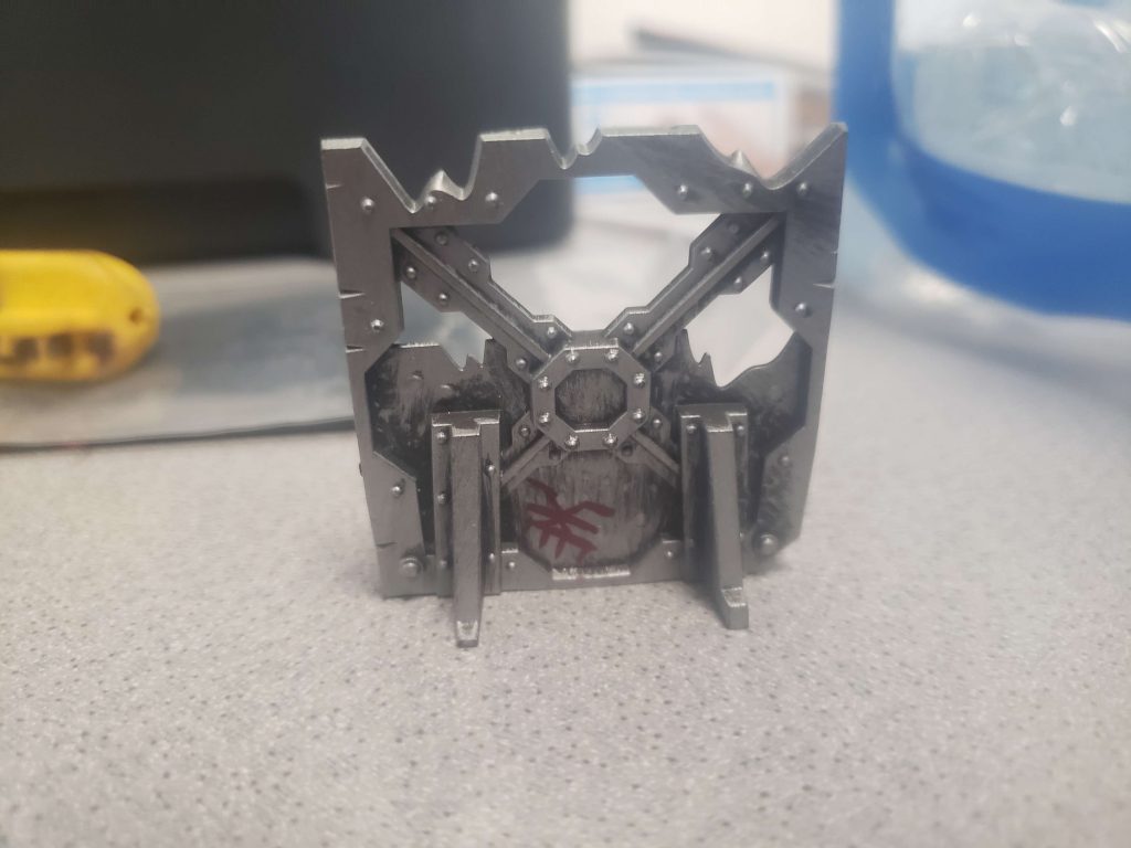 This one comes in from a friend of the show. Prime black, drybrush the hell out of it with silver. Freehand /pick out some details with red contrast. Done. Simple? Yes - but this looks great