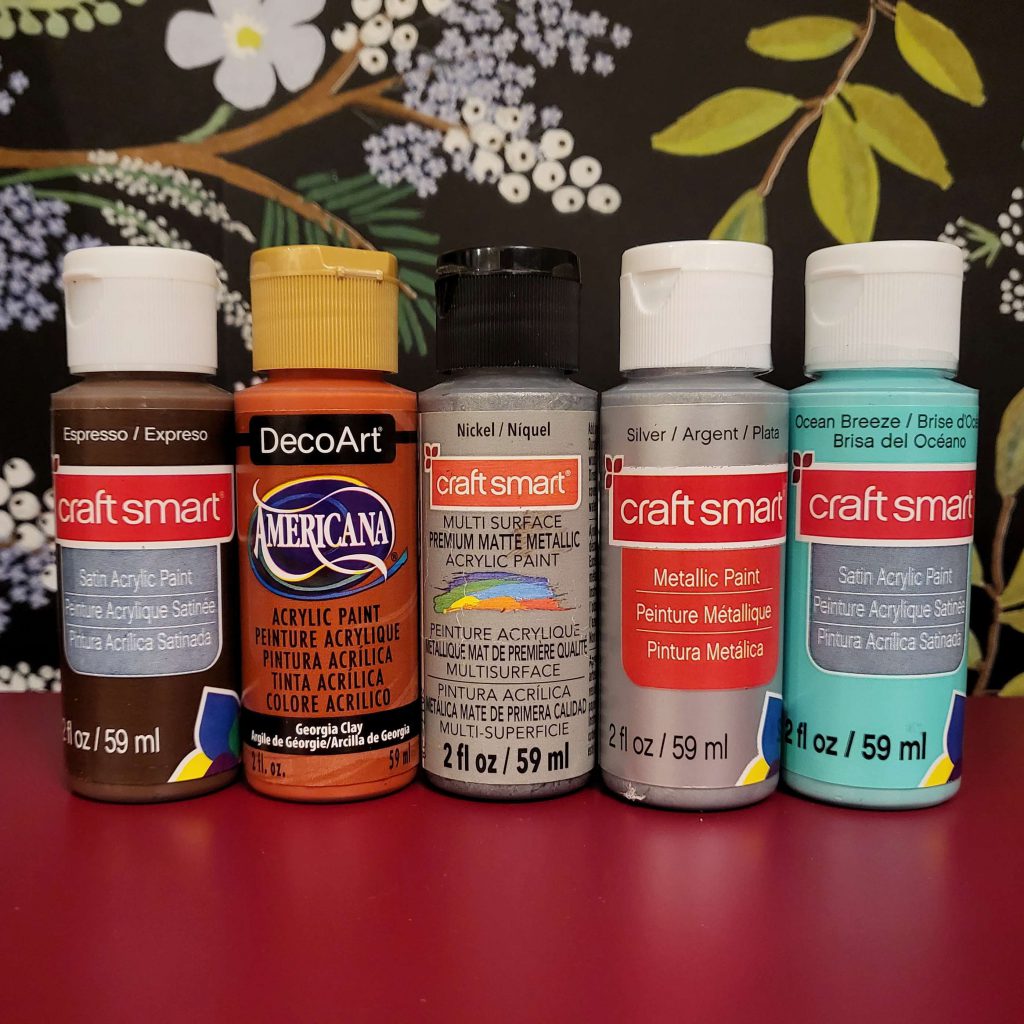 I started by priming black, as that will do some serious shading work for you. From there I picked out a limited set of craft paints. The core is two metallics; with a gunmetal (Nickel in this case) and a bright silver. You can also get away with just a bright silver, but having some definition helps. This is rounded out with a terra-cotta / clay (Maybe Ratskin Flesh) and an espresso brown (Mournfang or Dryad Bark work). Optionally, you can also add a light seafoam for a bit of verdigris.