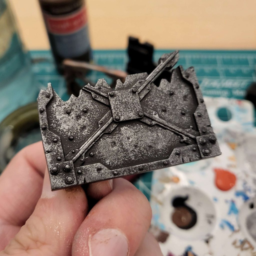 - Step 3: Drybrush Leadbelcher lightly to bring some color back