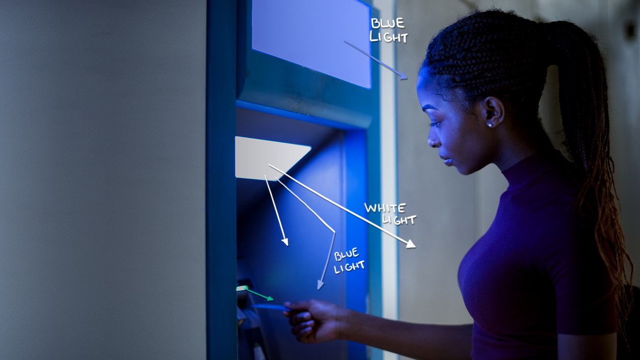In this example we have two different light sources: A blue light above the woman's head that's lighting her blue, and a white light from the ATM that's lighting the rest of her, and you can see the difference in how that affects the color of her forehead and hand in the photo above. There's also a separate thing going on where the blue wall of the ATM is doing some tinting, but that's kind of besides the point. The point is, we can paint a model normally when it's going to be in white light, and then apply OSL color