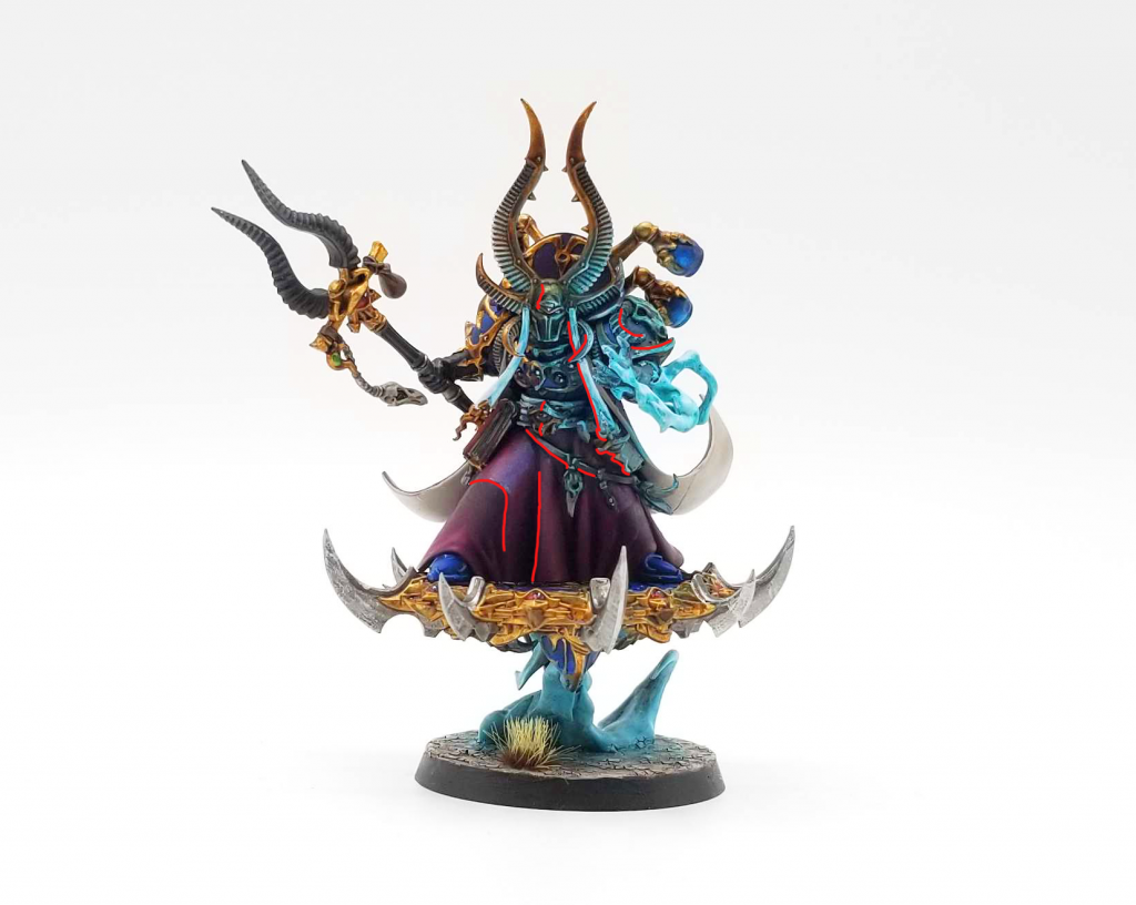 Drakenhof Nightshade. In the image below, I've pointed out a lot of the spots where I applied this wash to shade the model and make the effects more dramatic. Spots on the other side of the red lines are where I shaded with Drakenhof.