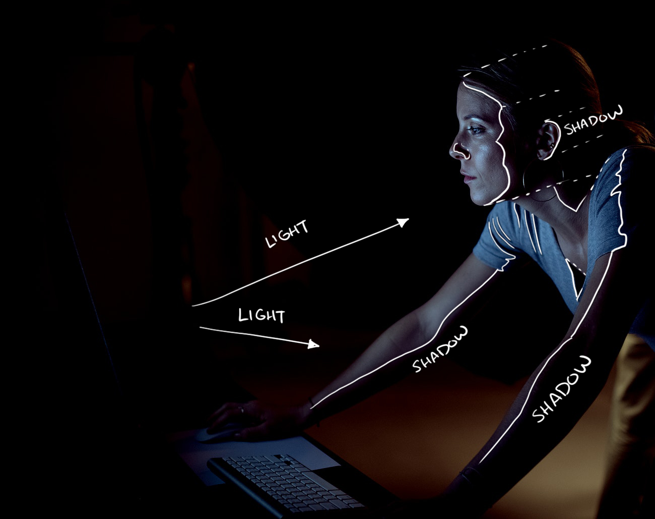 The best way to start here is to look at reference photos. I've pulled a few choice options off of RawPixel's large library of public domain images. Generally when we do OSL we're looking to do more dramatic effects, and so when you're looking for reference photos it can be helpful to pull images of people in low lighting.