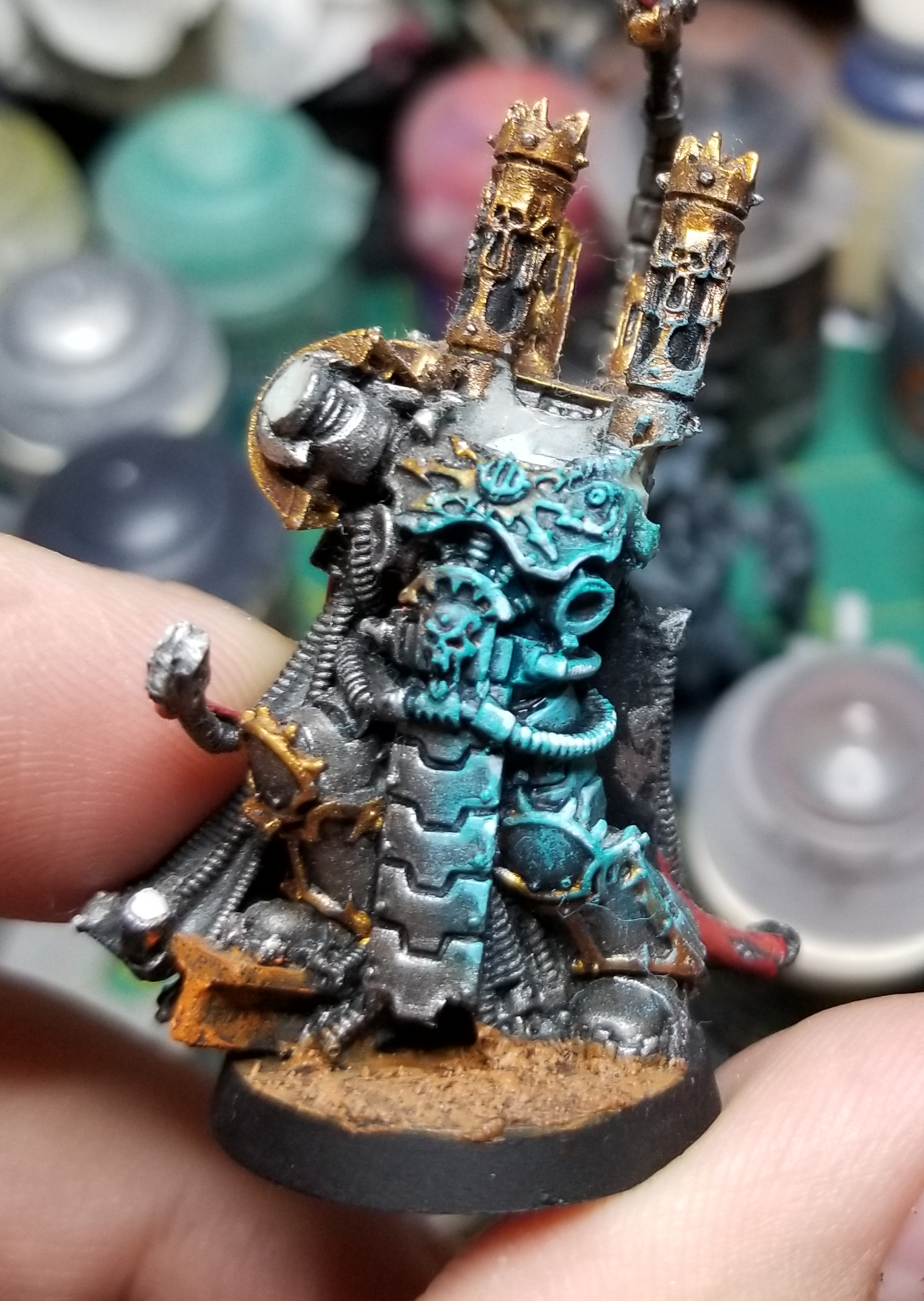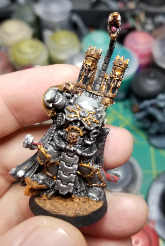 I originally painted this model to be an Iron Warriors Warpsmith back in like 2013. He broke apart when I moved and I decided a good time to fix him and repaint him was "never." Finecast sucks and I hate it. The key thing here is that I've already painted the model normally - he's painted like I'd paint him if he wasn't being lit with OSL. that's important. Next I need to plan my lighting.
